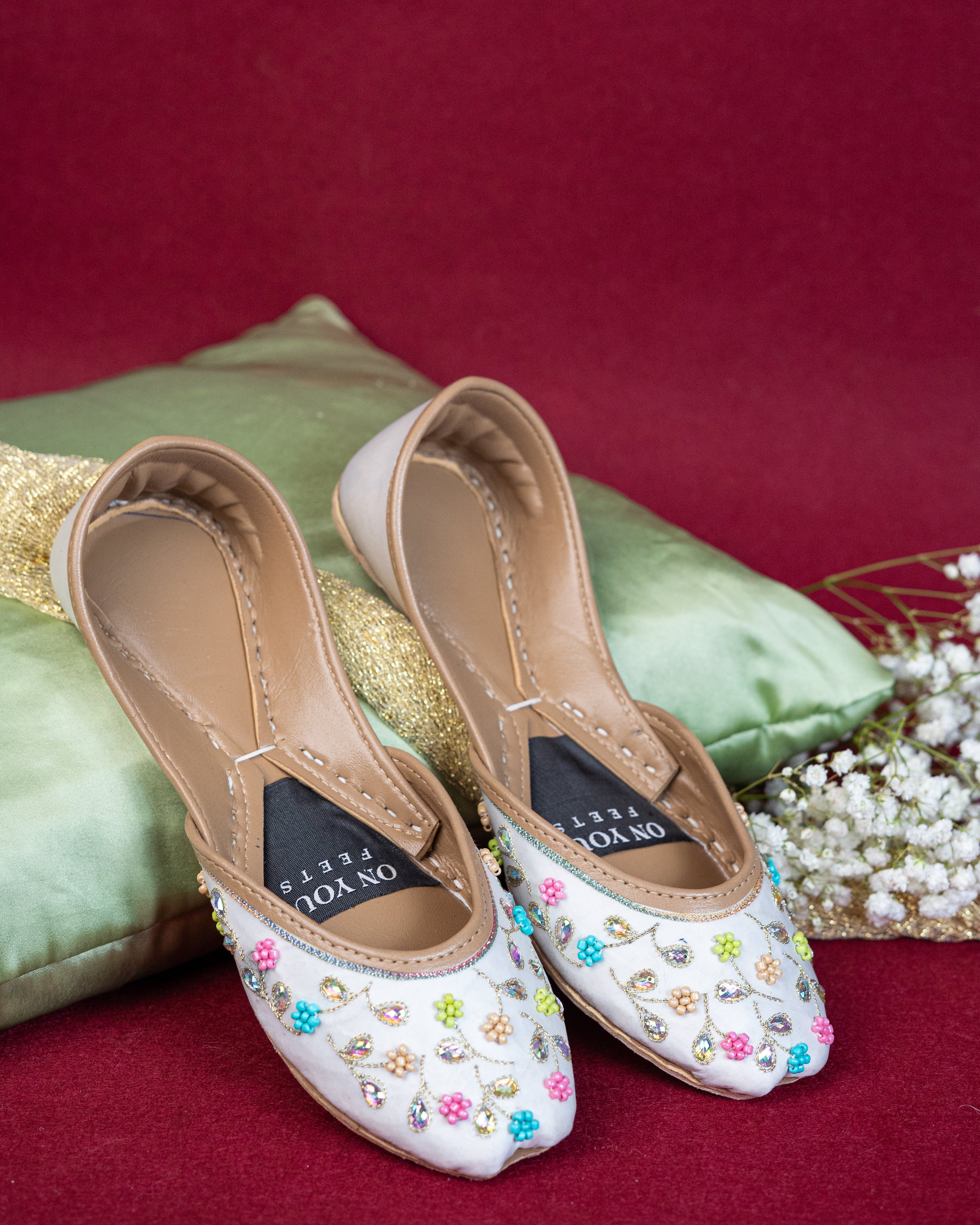 Elevate your footwear collection with these stunning Ivory Blossom embroidered khussa. Designed on a soft ivory base, these handcrafted flats feature intricate floral embroidery in pastel hues, complemented by shimmering embellishments. The delicate vine pattern adorned with colorful beads and mirror-like accents creates a graceful yet vibrant aesthetic. These juttis are crafted for both style and comfort, with a cushioned insole and premium finish. Perfect for festive occasions, weddings, and casual ethnic wear, they effortlessly add a touch of elegance to any outfit.