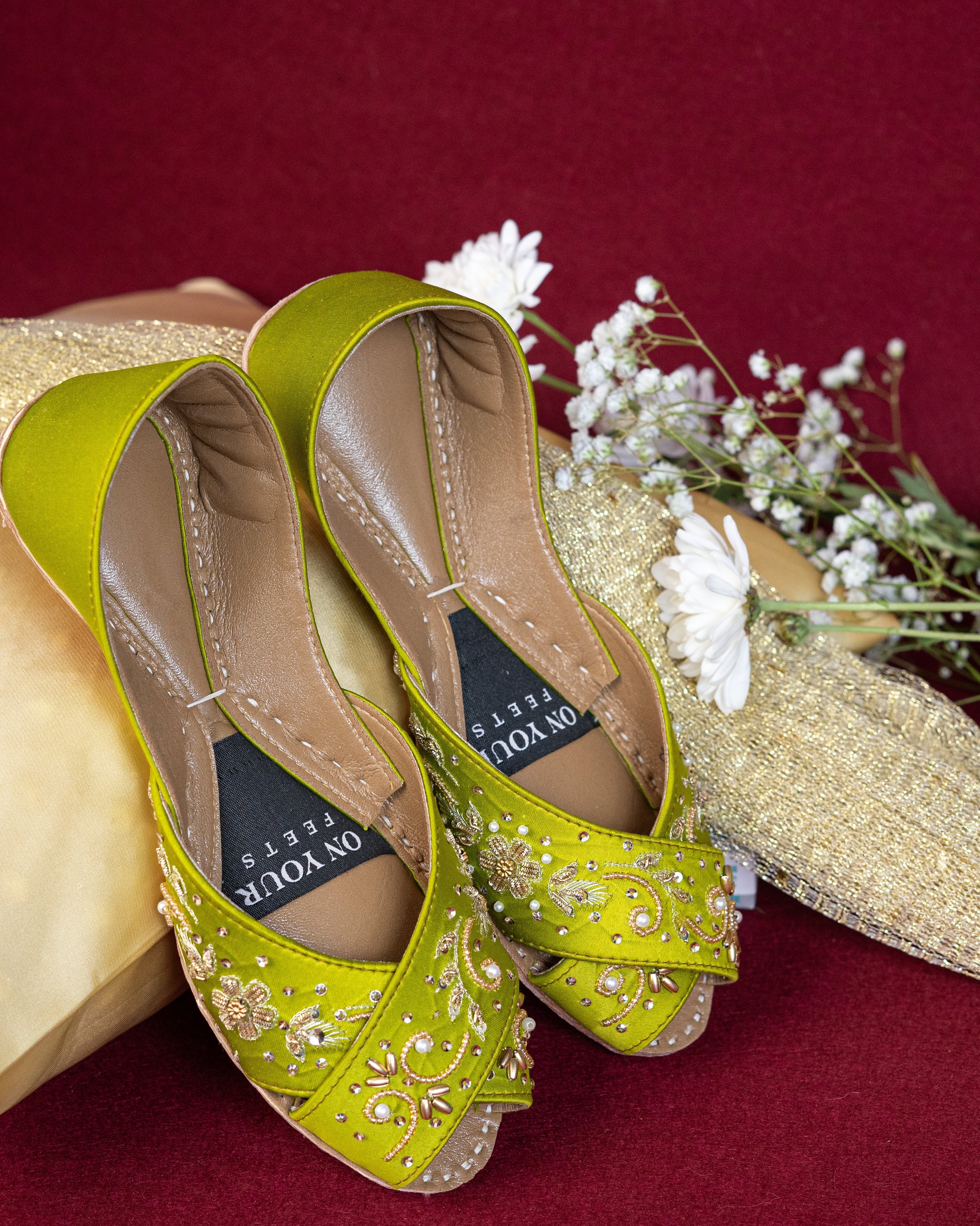 Make a bold style statement with these exquisite royal red embroidered khussa. Handcrafted with intricate gold thread embroidery, shimmering beadwork, and delicate embellishments, these juttis exude elegance and tradition. The crisscross strap design adds a contemporary touch, ensuring both comfort and sophistication. Made with premium-quality materials and a soft cushioned sole, they are perfect for weddings, festive occasions, and cultural celebrations.