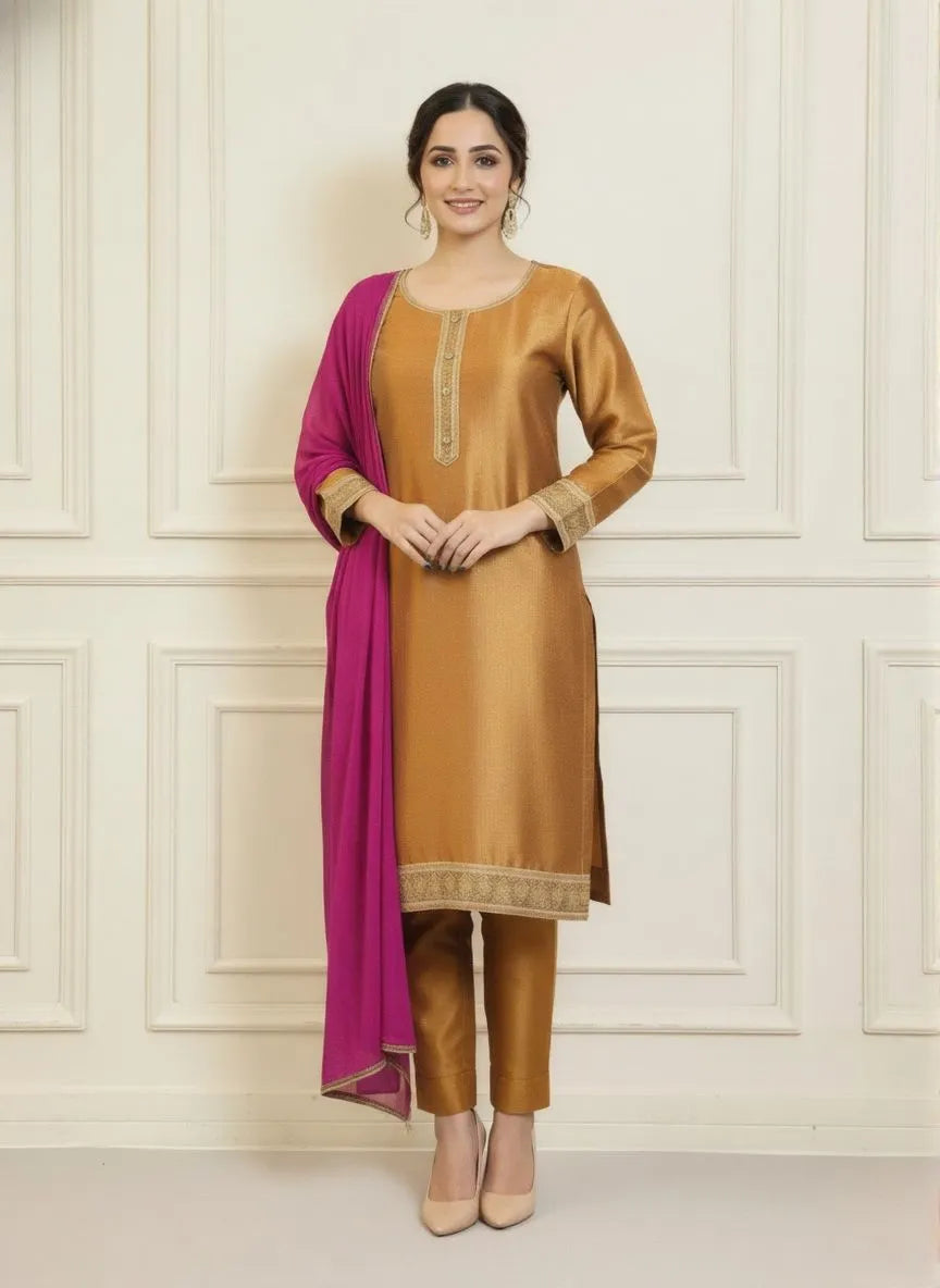 This exquisite three pieces suit crafted from luxurious dobby fabric. Adorned with intricate soft cooper hand and machine embroidery, the top boasts a stunning visual appeal. The embroidery featuring gold adds a vibrant touch with all-over sequin work