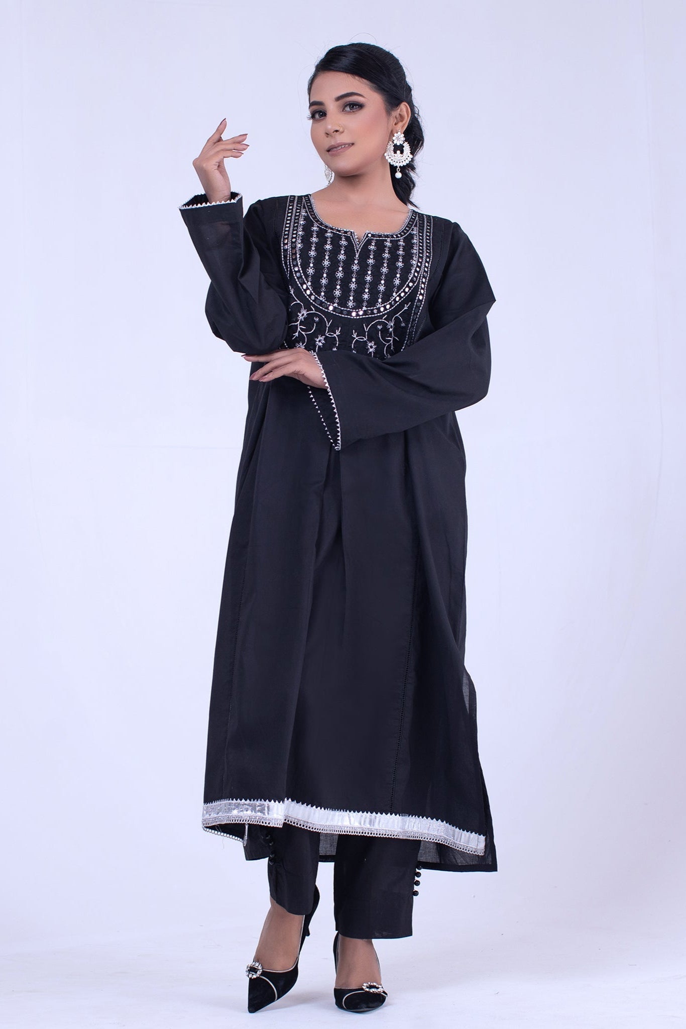 The intricate embroidery work with 9 mm sequence and zari patterns evoke a sense of grace and elegance. Experience comfort and style with silver lace work at daman/Sleeve and Neck on high-quality cotton fabric. Th black ladder lace at body with intricate 9 mm sequnce resembles with mirror work . Perfect for any casual or event occasion, elevate your wardrobe with this must-have piece. |
