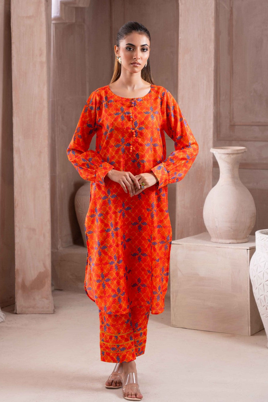 Orange Dream a digital printed shirt with round neckline adorned by multiple loops. Cuff on sleeves with gathers and paired with a matching trouser, stay cool and sophisticated with this must-have addition to your wardrobe.