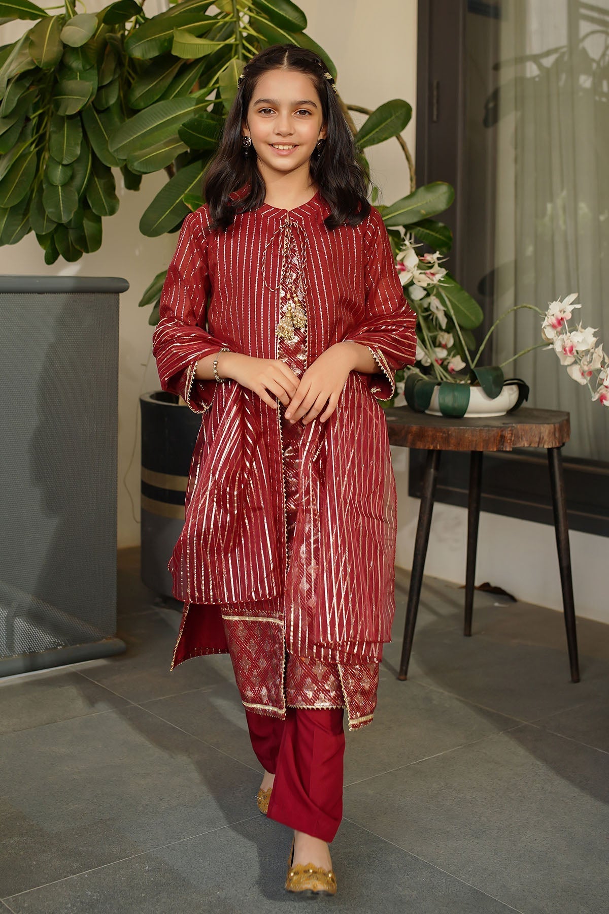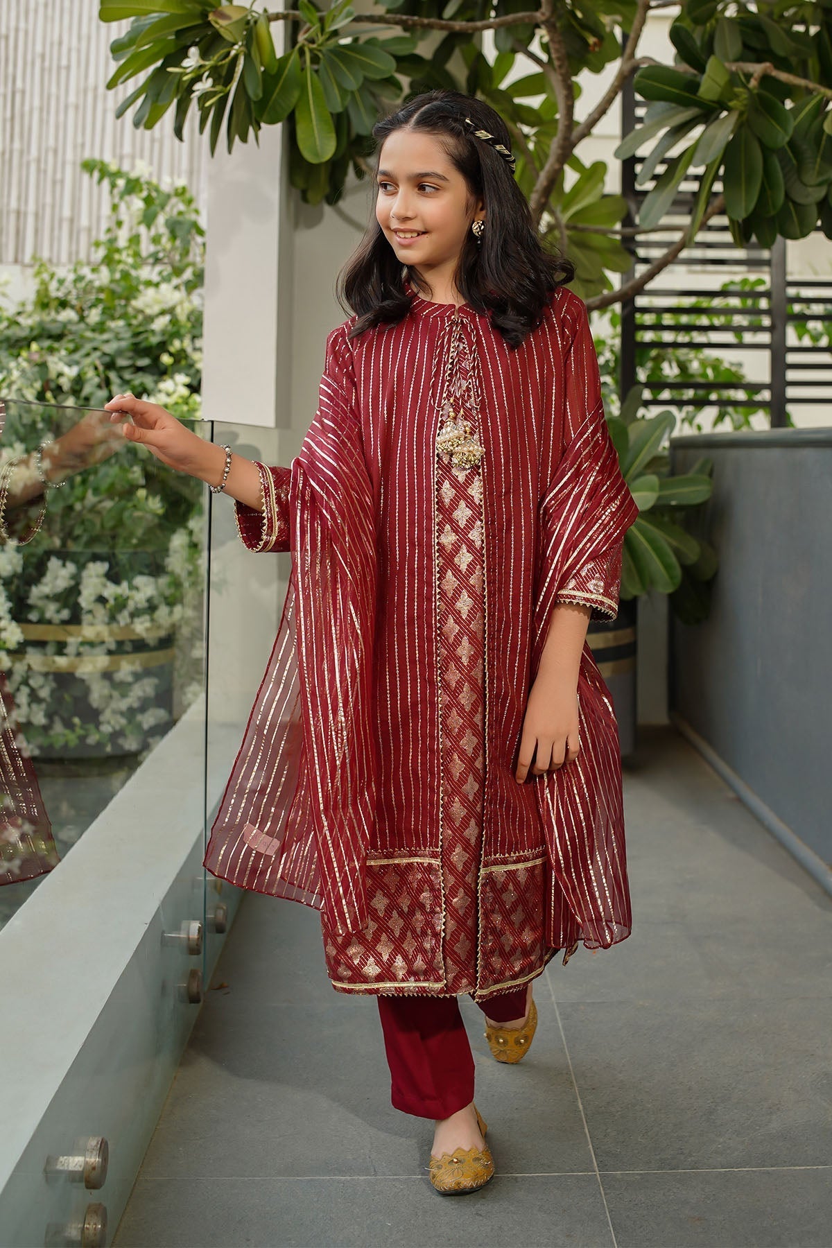 Top: Maroon Zari Jacquard Coat Style Kurta with Tassel, Laces and Malai Crepe LiningBottom: Maroon Malai Crepe TrouserDupatta: Maroon Zari Jacquard Dupatta