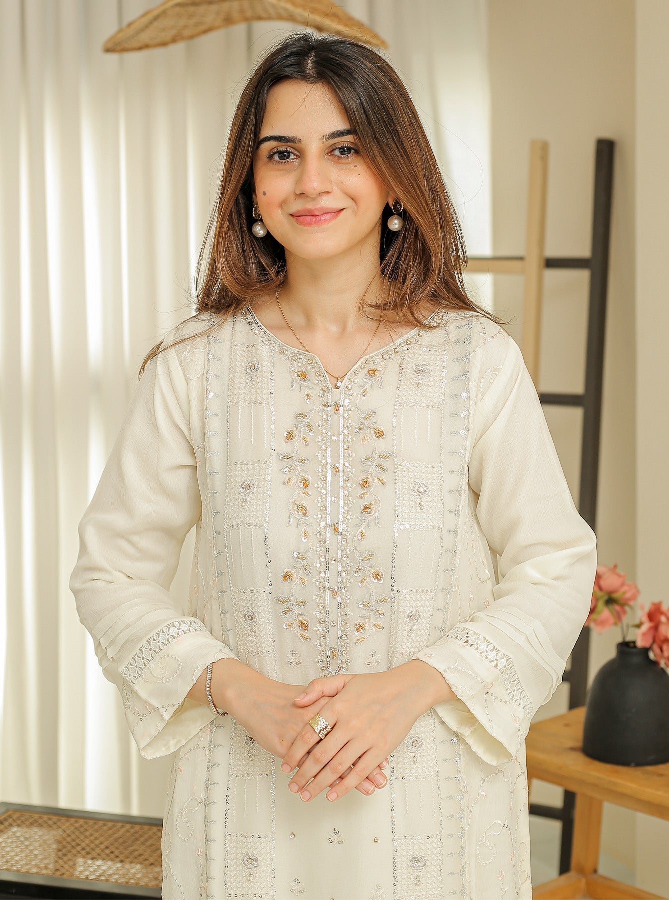 Introducing our elegant embroidered chiffon shirt with matching pants, designed for those who value intricate detailing and timeless elegance. Made from premium fabric, this dress provides a light, luxurious feel, ensuring comfort and sophistication all day long. The set includes matching pants and a dupatta, enhancing the overall look and adding a touch of glamour to your outfit.