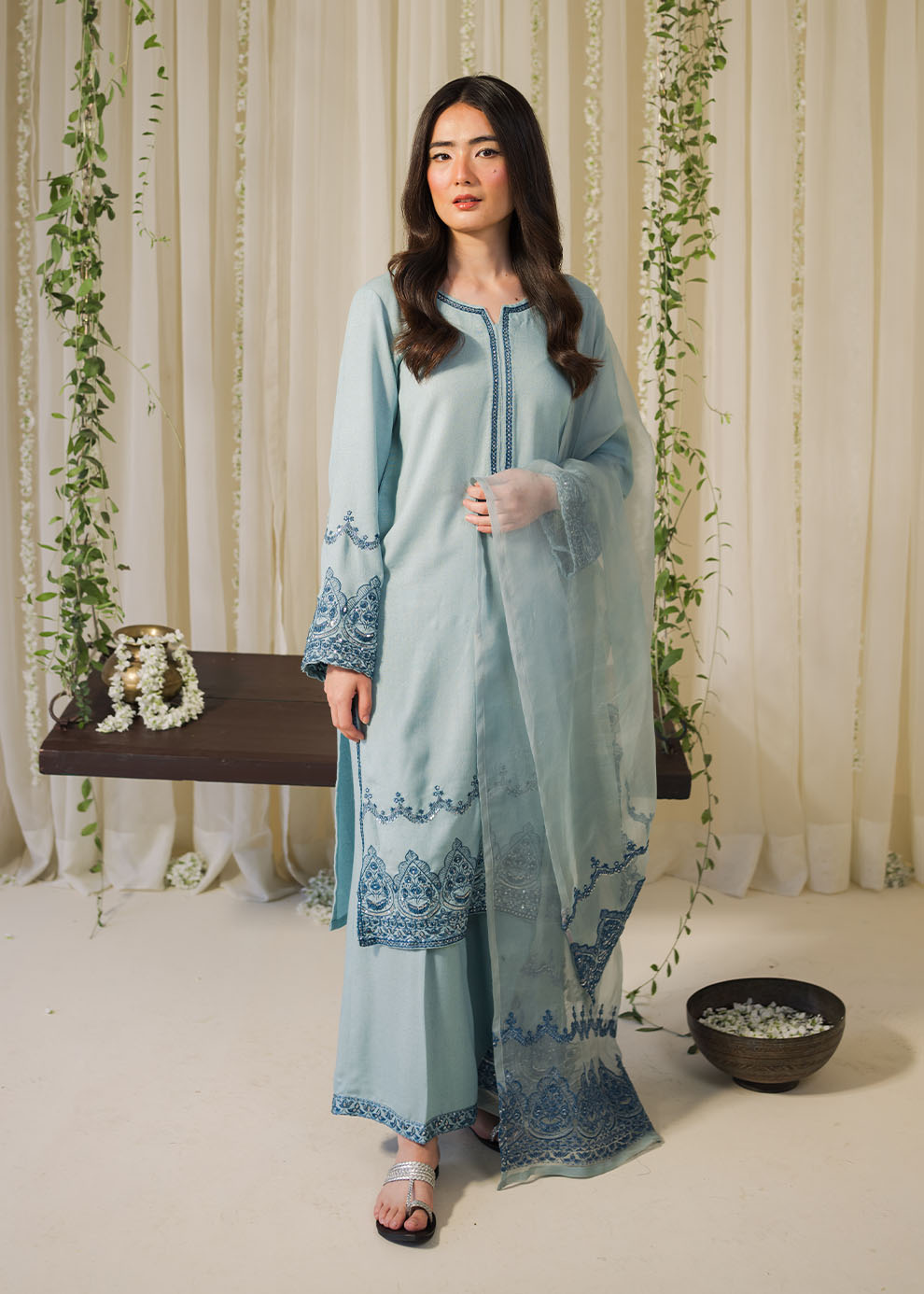 This aqua blue ensemble features intricate sapphire blue and silver sitara embroidery, creating a delicate and refined look. The shirt is paired with embroidered culottes, adding a touch of elegance to the overall design. A sheer organza dupatta with matching embroidery completes the outfit, enhancing its sophisticated appeal. Made from premium cotton lawn, the fabric ensures comfort while maintaining a polished and graceful appearance.