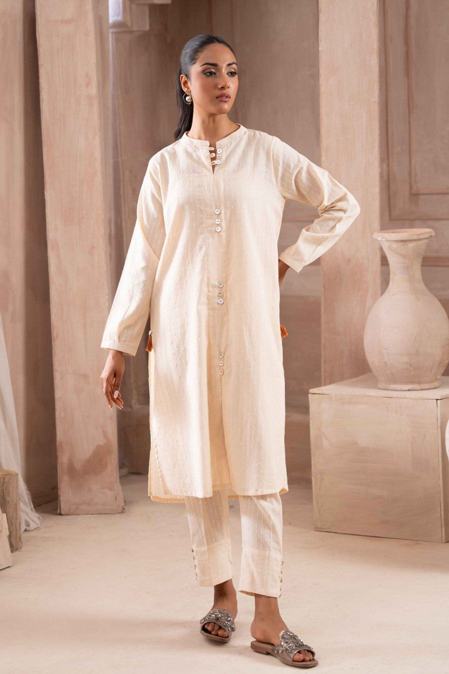 Peace this stunning ensemble illustrates an elegant vanilla cream canvas hue for a unique and surreal look. Featuring a contemporary shirt with buttons at the front and paired with a matching trouser, this trendy outfit is perfect for this season and will give you a graceful look.