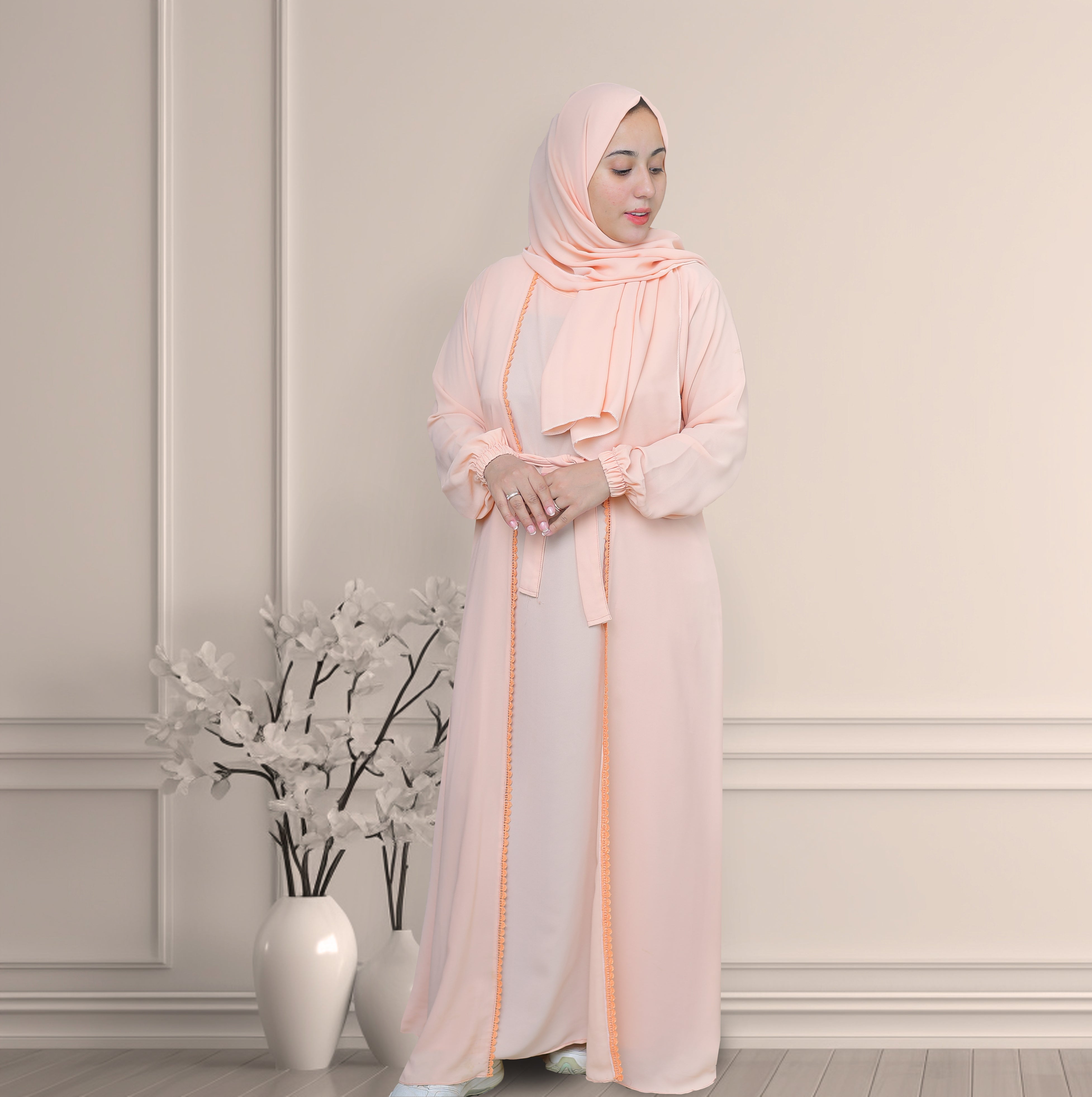This elegant ensemble is crafted from premium chiffon fabric, offering a lightweight and flowy feel. The soft peach tone is enhanced with delicate lace detailing along the edges, adding a touch of sophistication. The outfit comes complete with a matching hijab and a belt to accentuate the waistline, providing a graceful and modest look perfect for special occasions.