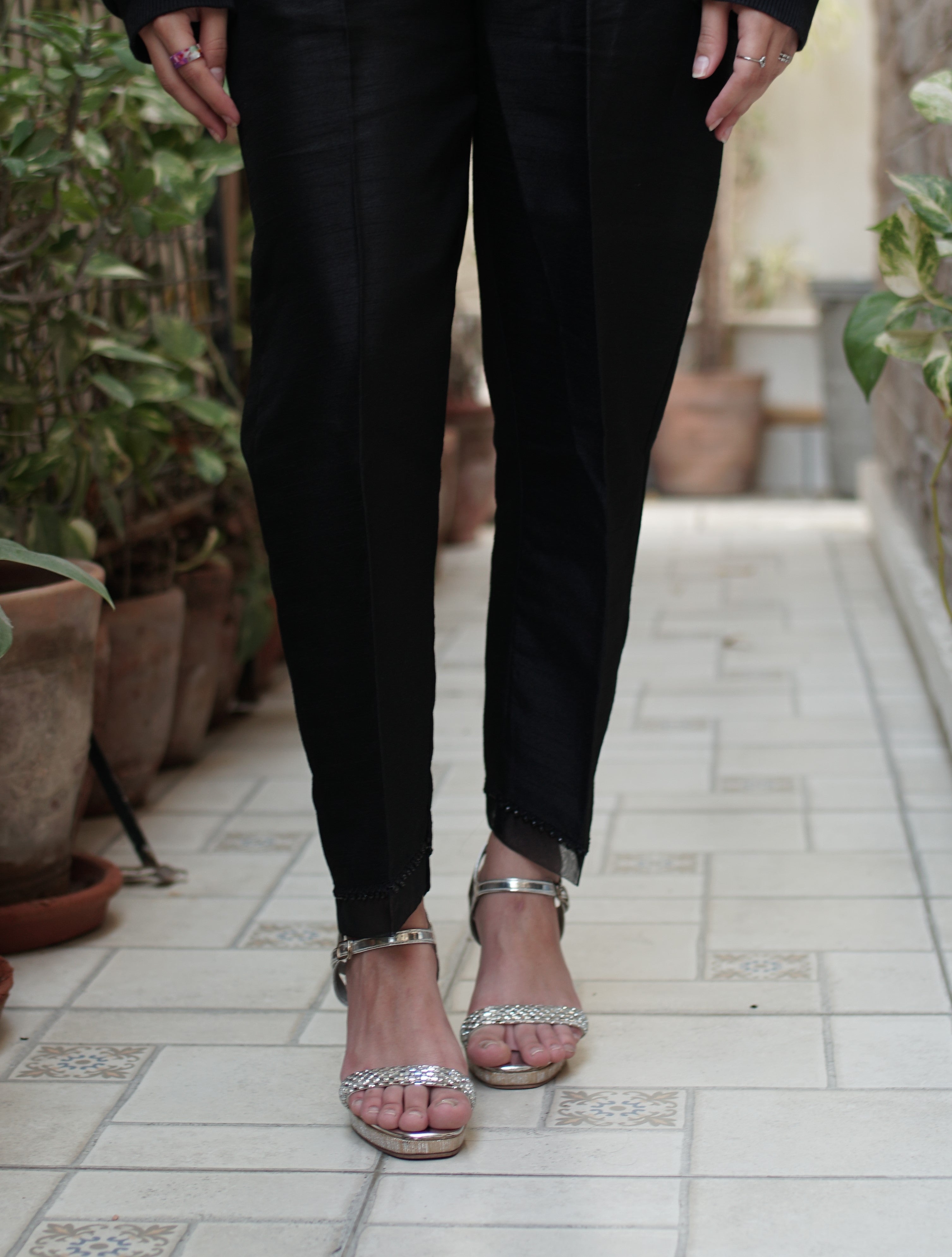 Straight fit trousers stitched to perfection with Pakistani raw silk, finished with organza and embellished with a pearl lace to add glamour to your semi-formal looks
