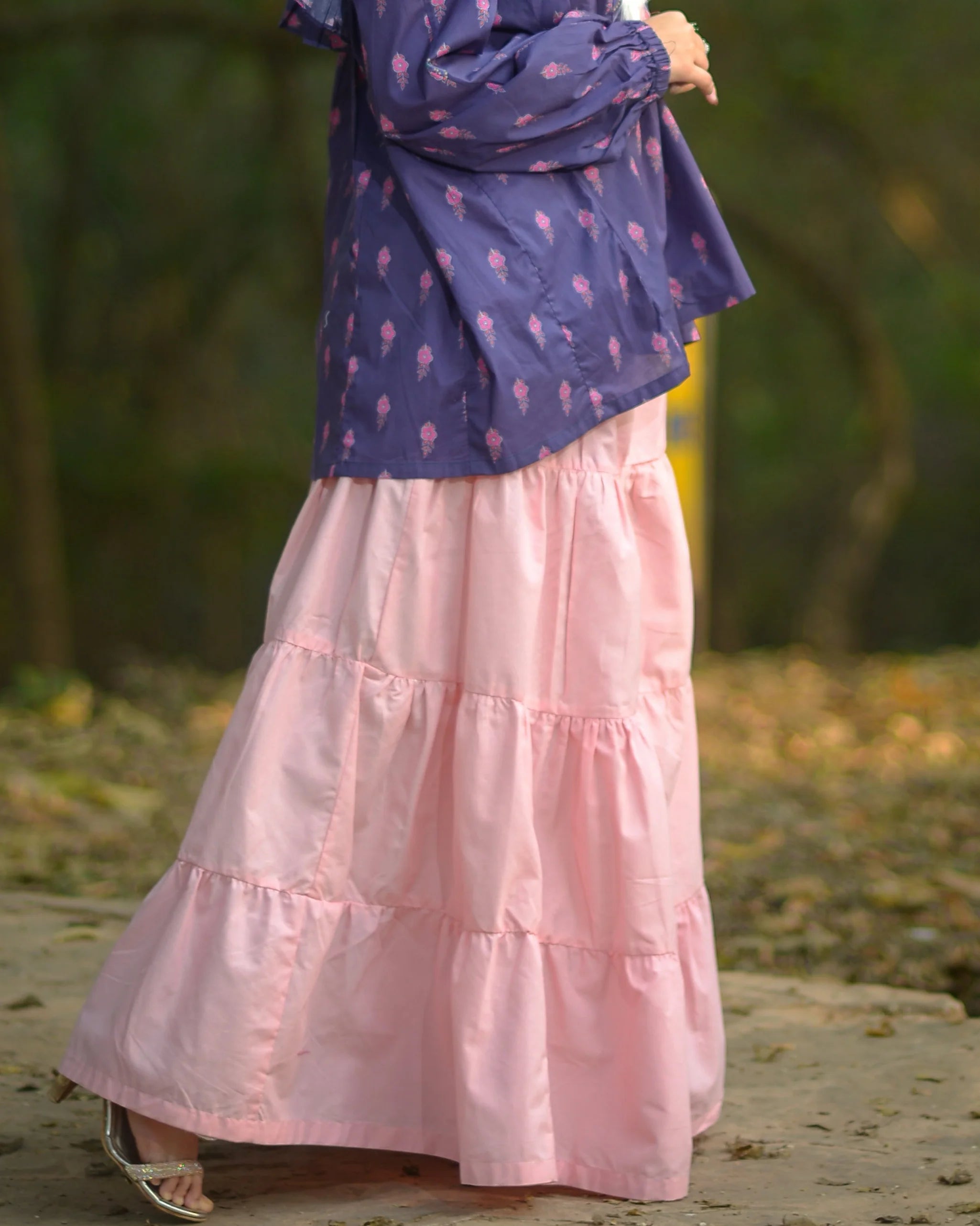 Designed in a tiered silhouette, it offers graceful flow and movement, perfect for both casual outings and semi-formal looks.