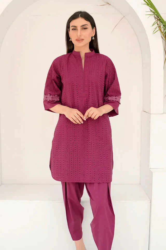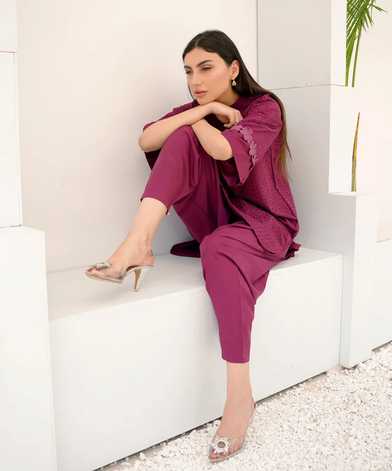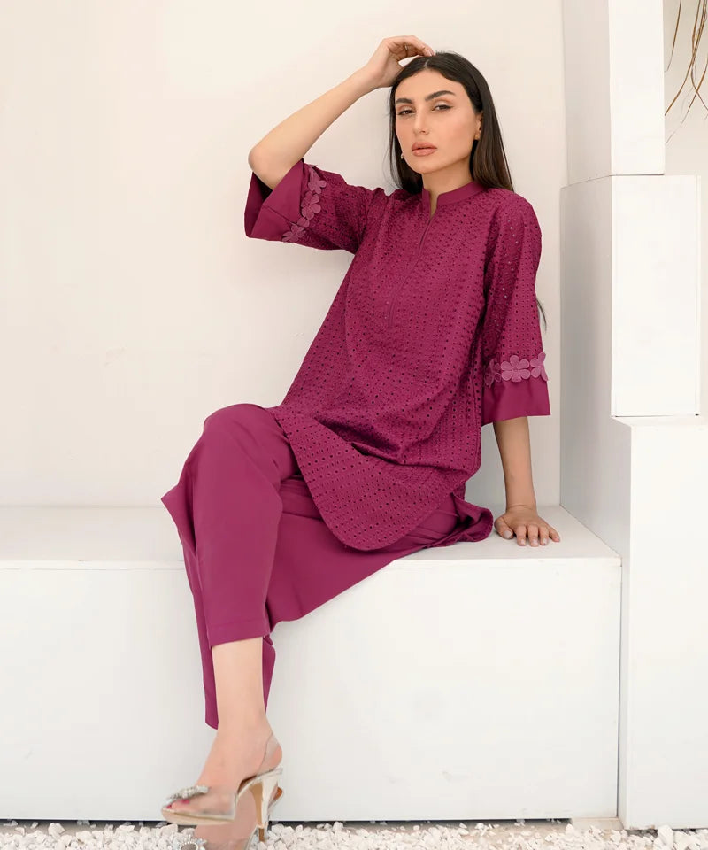 This article consists of a Schiffli embroidered 2-piece co-ord set traditional ensemble with a modern twist. The outfit consists of a mid length style shirt and fitted pants.