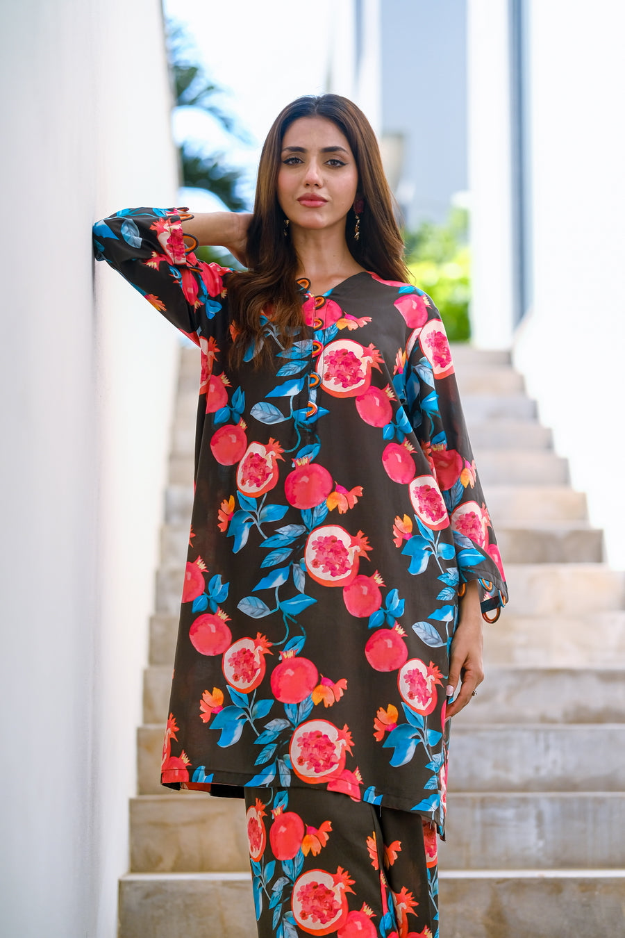 This chic black two-piece cotton lawn outfit features vibrant pink pomegranate prints. Perfect for summer, it combines style and comfort with a relaxed-fit top and matching bottoms. Ideal for casual outings or lounging, this playful yet elegant set adds a unique touch to your seasonal wardrobe.