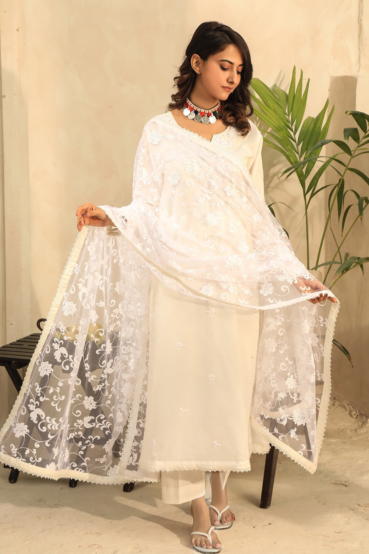 This outfit includes patched work embroidered details on the shirt front, back, and sleeves, along with hand touch-ups for a subtle enhancement. Paired with lawn trousers and a lace-finished embroidered net dupatta, it?s a practical yet stylish choice.