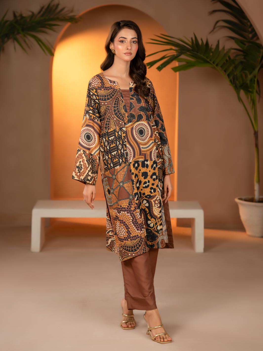 A bold celebration of earthy tones and tribal patterns, this printed shirt features a fusion of ethnic motifs, animal print, and geometric detailing — evoking the raw charm of desert art. Paired with rich chocolate brown trousers, this ensemble is a perfect blend of heritage and modern elegance.