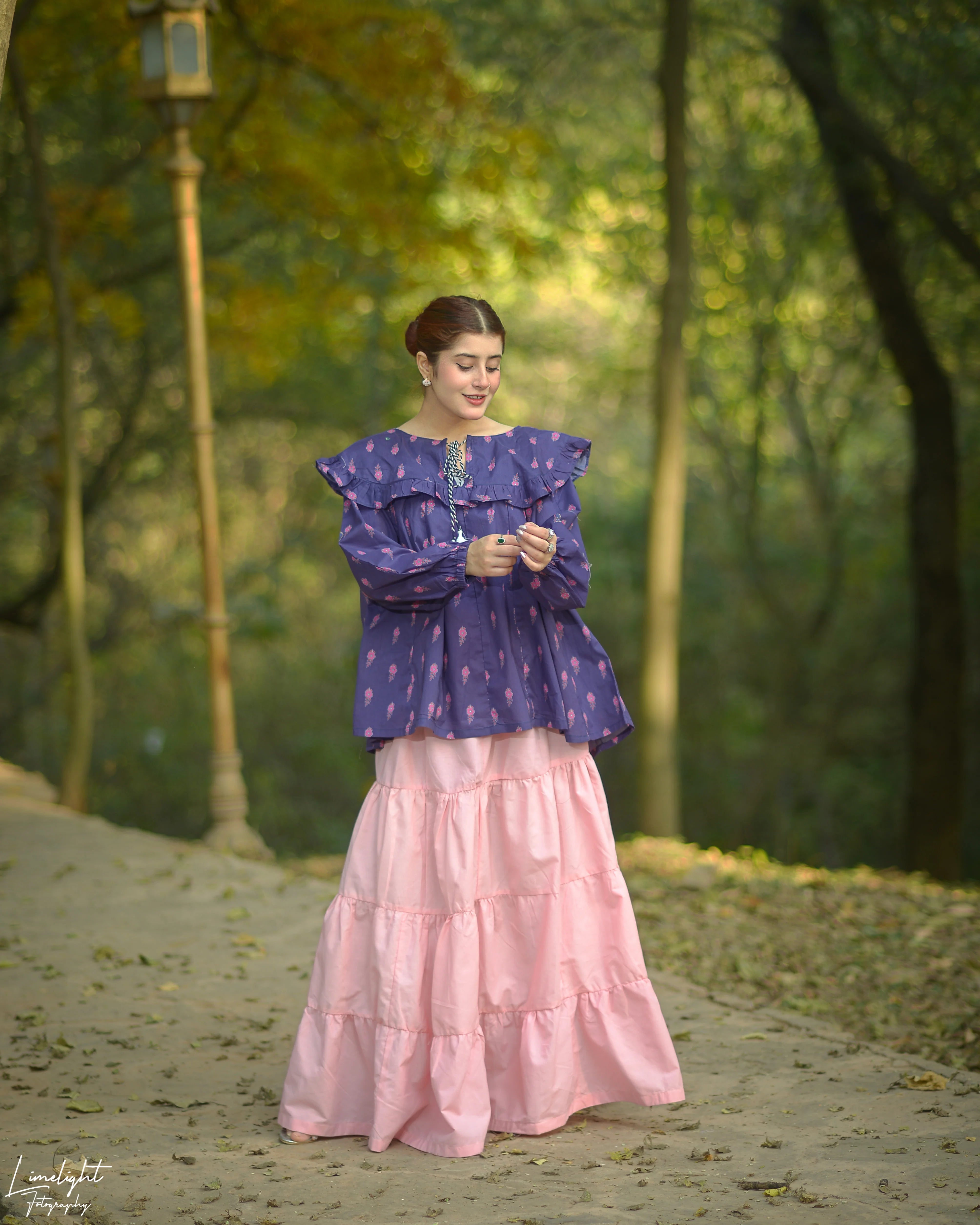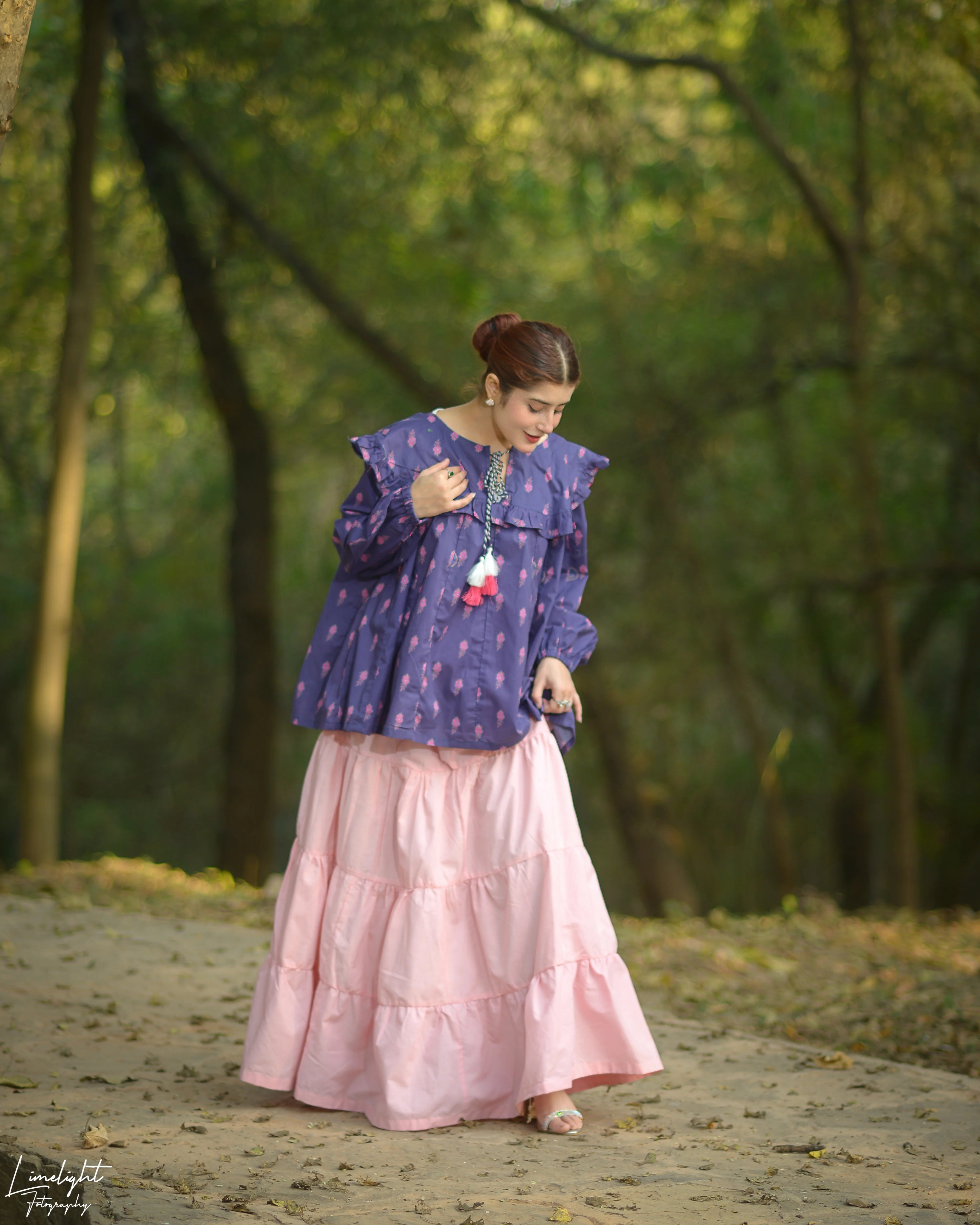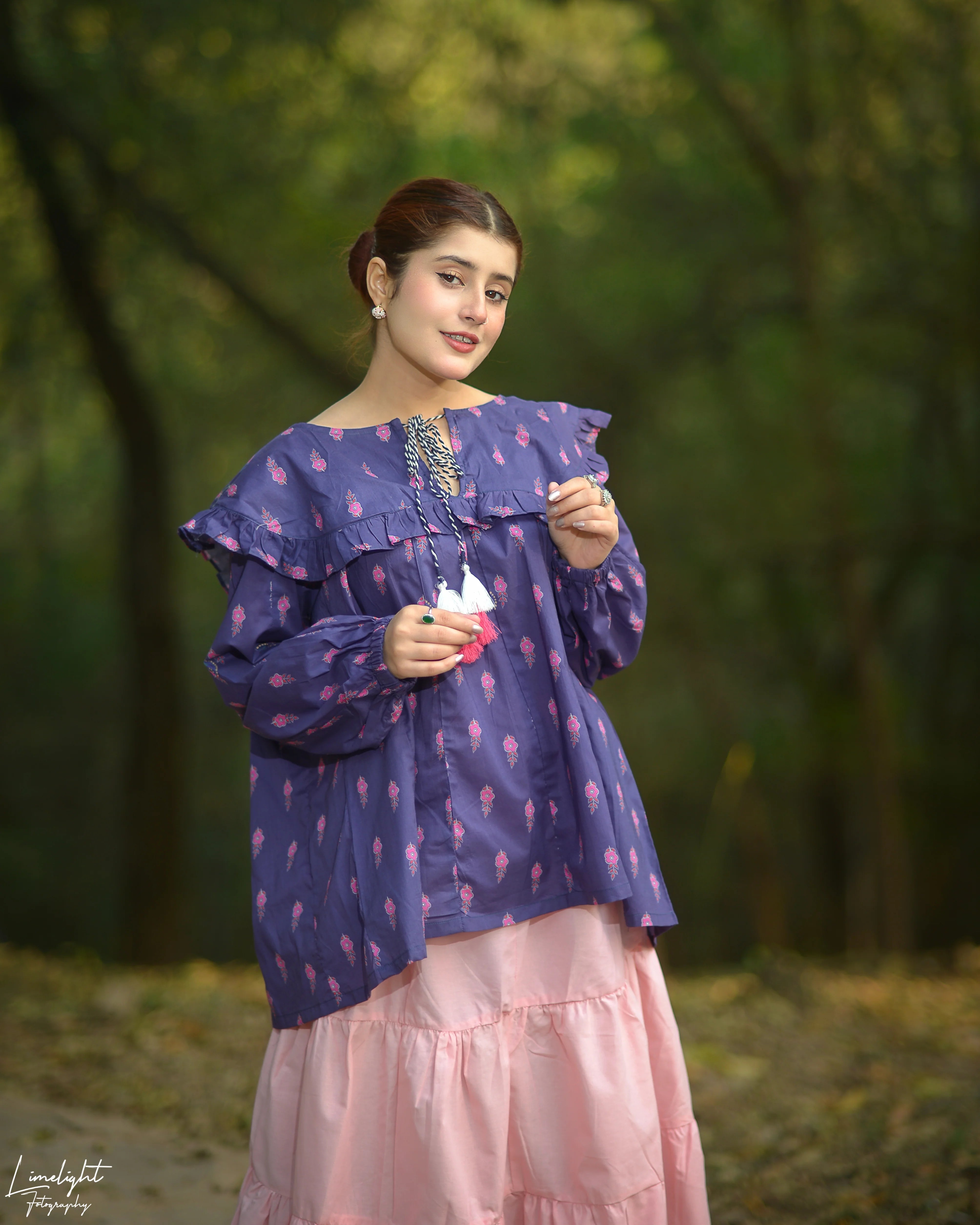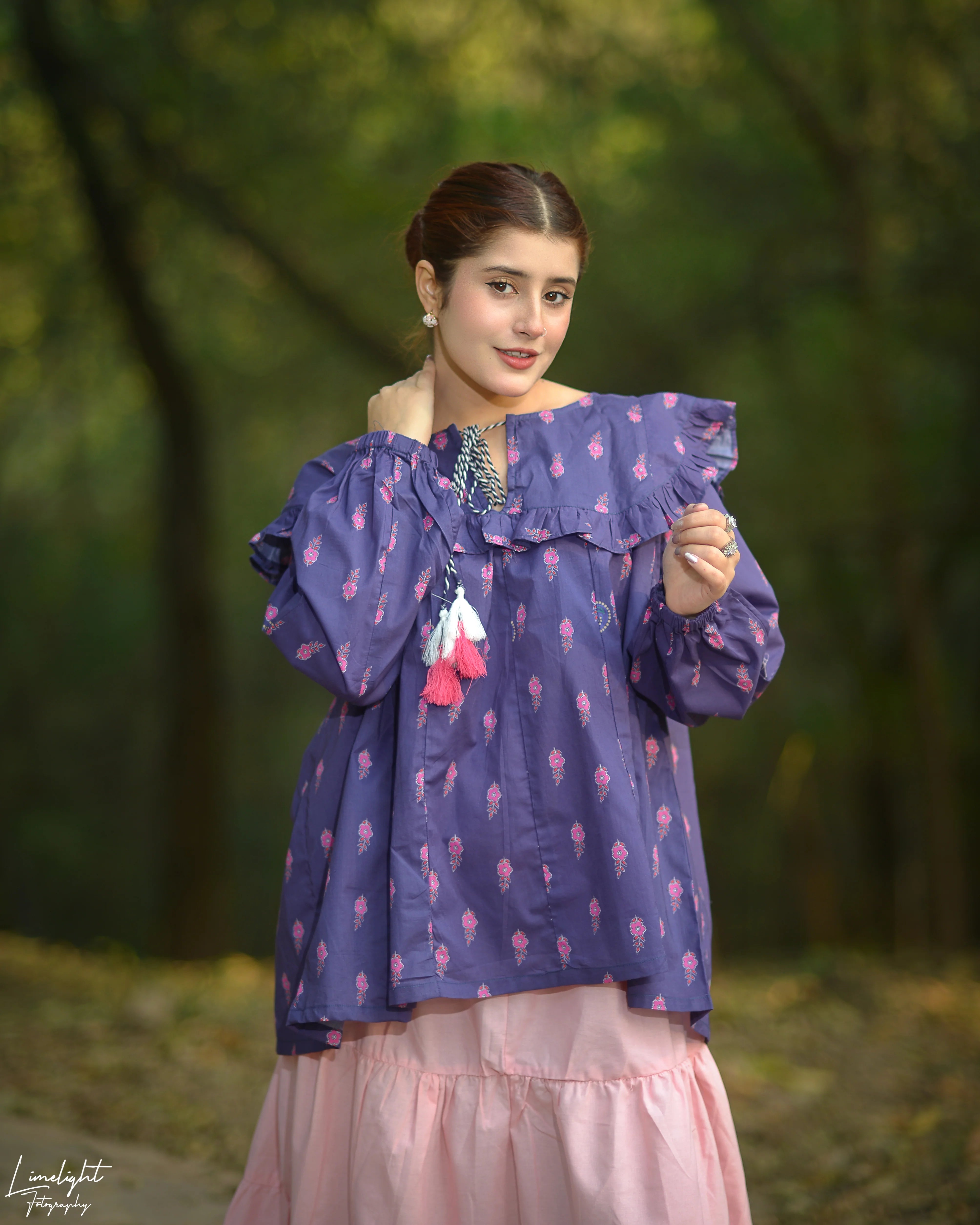 A breezy cotton peplum top featuring an all-over delicate print, layered ruffle neckline, and playful tassel ties. Designed for effortless everyday wear with a relaxed yet stylish silhouette.