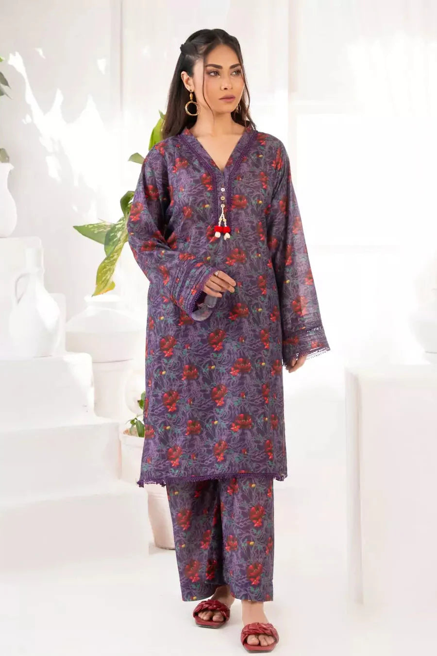 This enticing article features a purple two-piece printed Co-ord with a straight shirt and elegant neck design with lace and fancy button, all finished with a lose bottom pant.