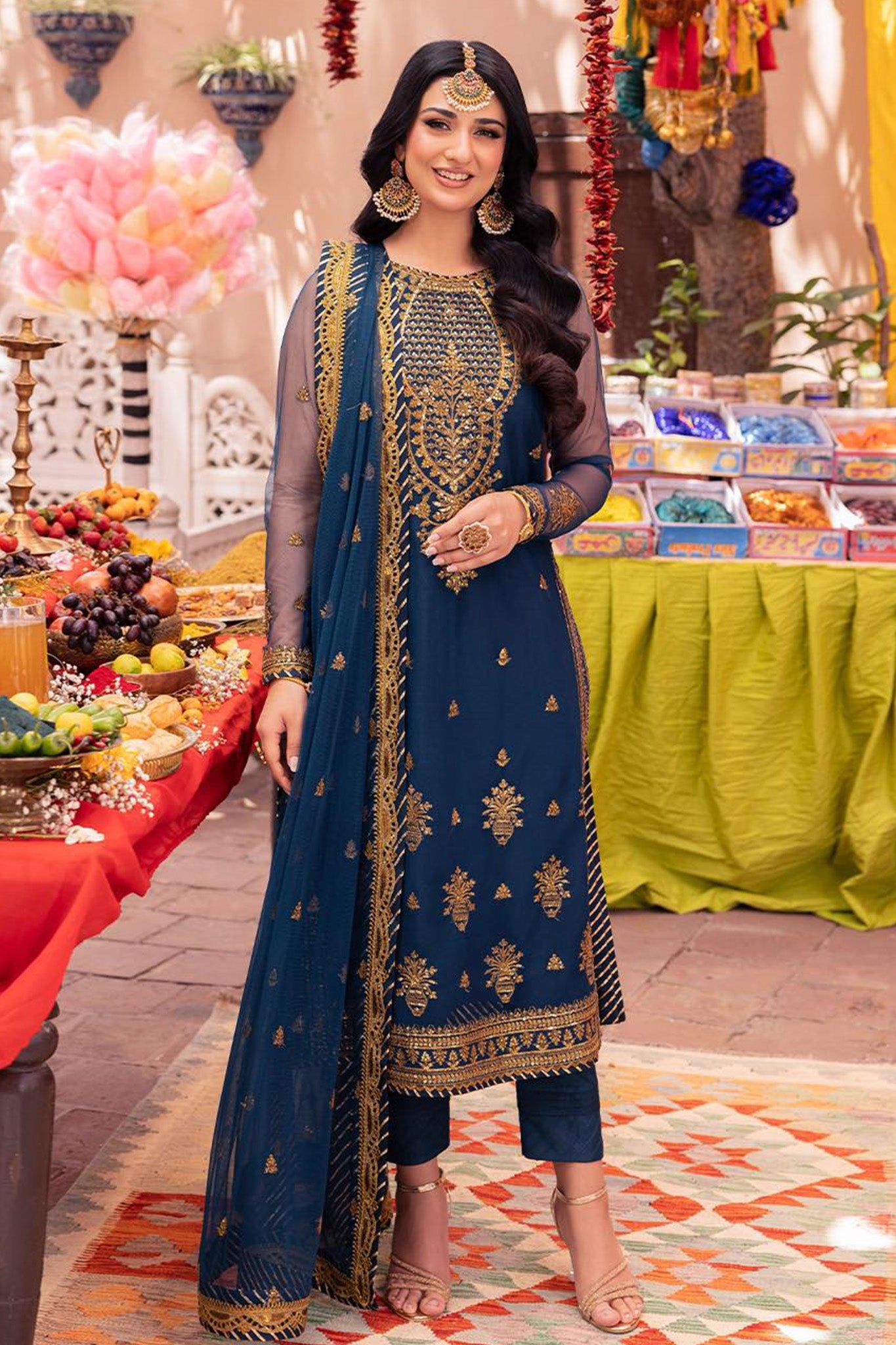 • Embroidered front neckline on net • 30'' embroidered front with border on net • 30'' dyed net for back...