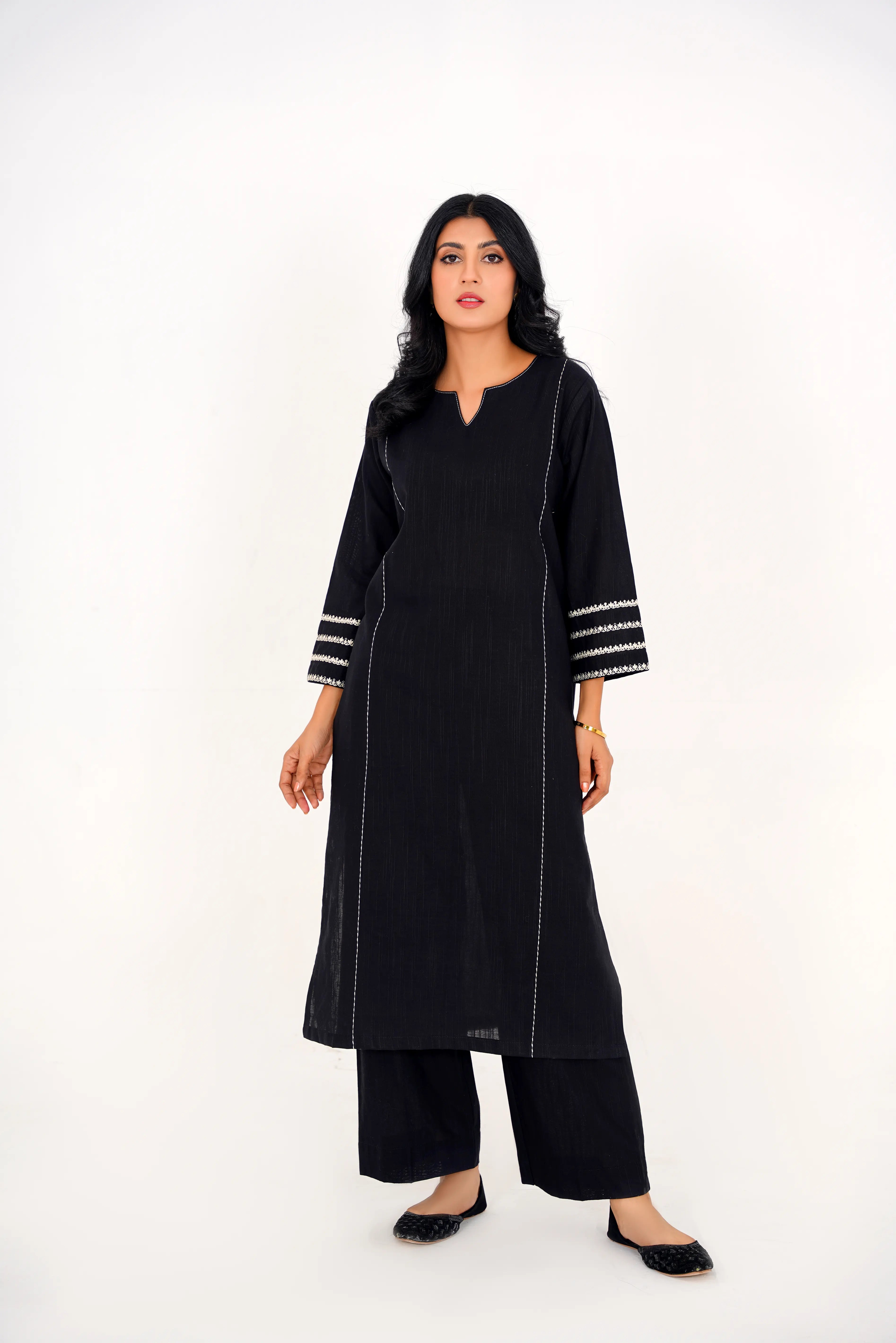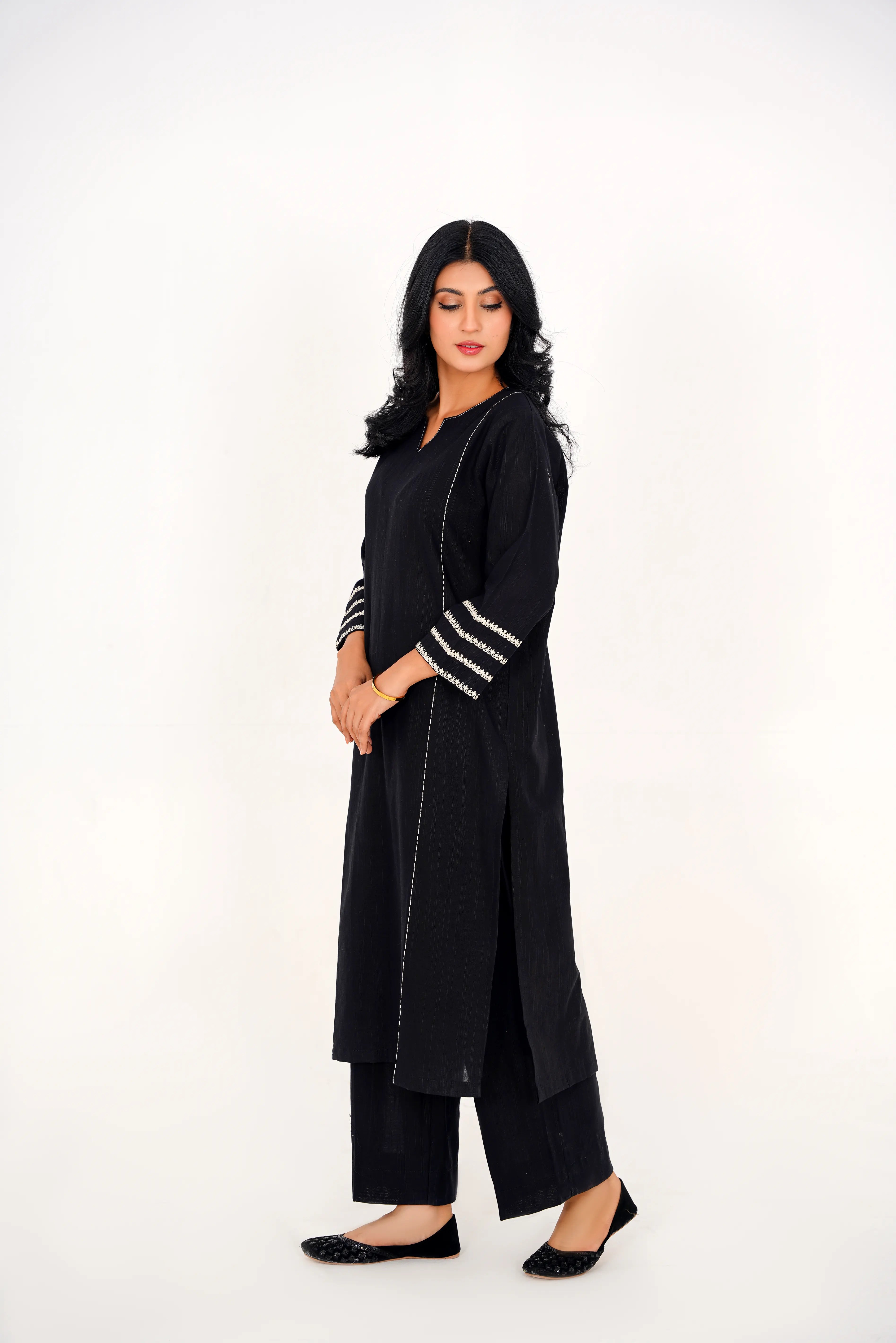 This dress is made from premium black Khaddar fabric, chosen for its ability to keep you warm and comfortable during the winter season. The rich black hue adds a touch of elegance to your ensemble.