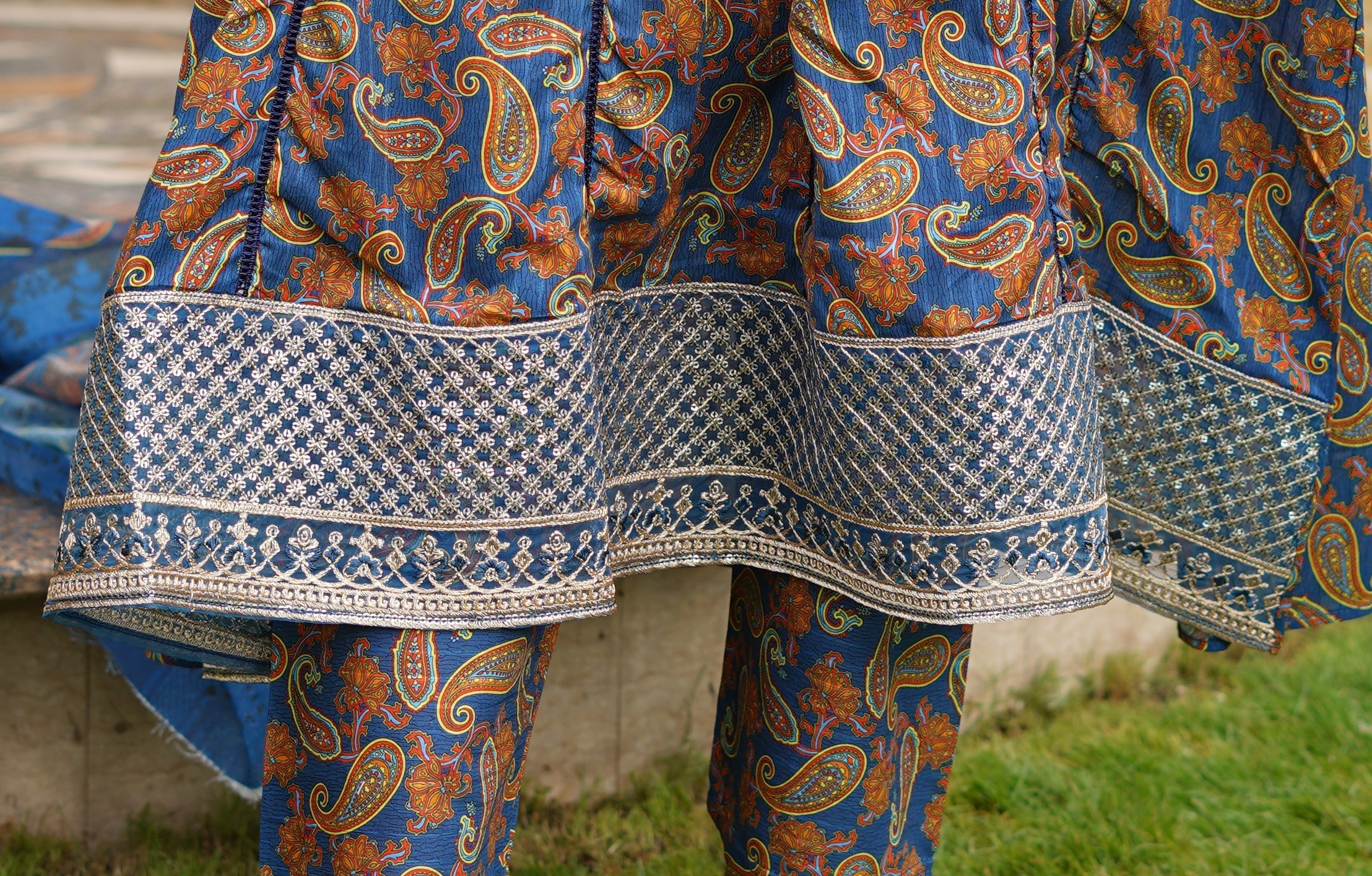 This exquisite festive/party wear pishwas set exudes elegance in deep purple. The straight cut kurta features intricate embroidery, while the cotton shalwar adds a traditional touch. Complete with a matching dupatta in lawn fabric, this 3-piece ensemble is perfect for all seasons. Lining attached for convenience. Brand: Gulposh By Kkt.