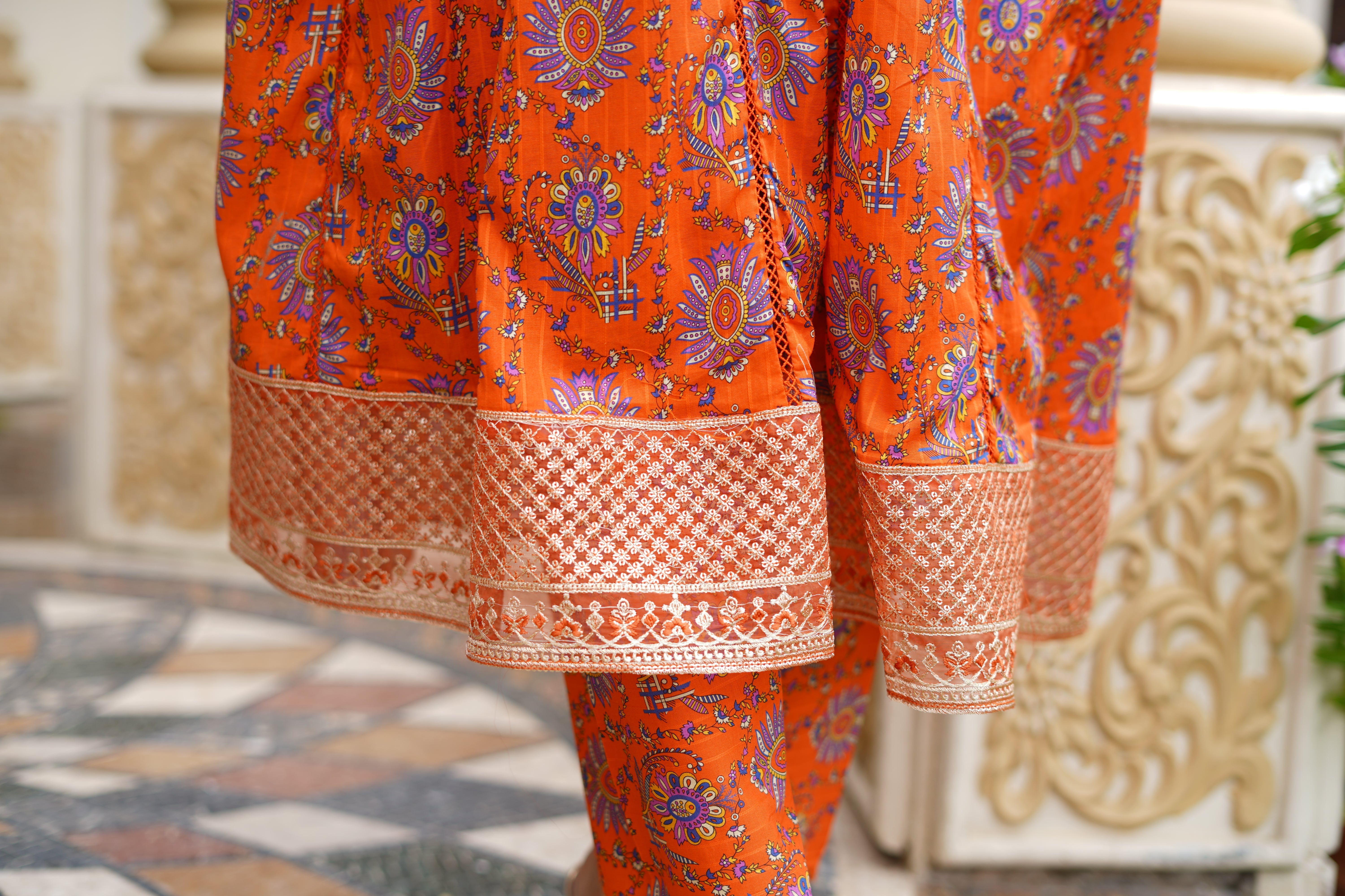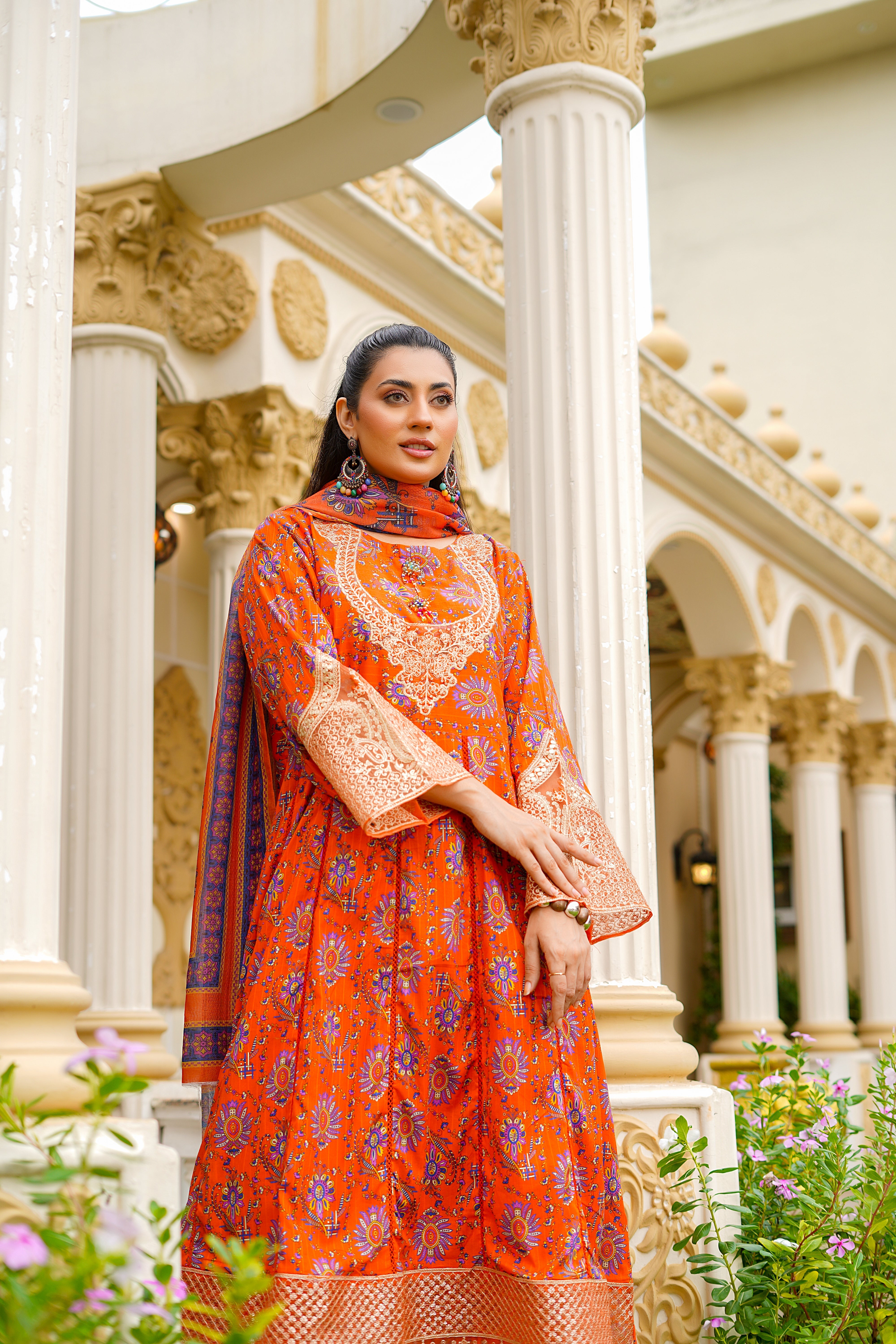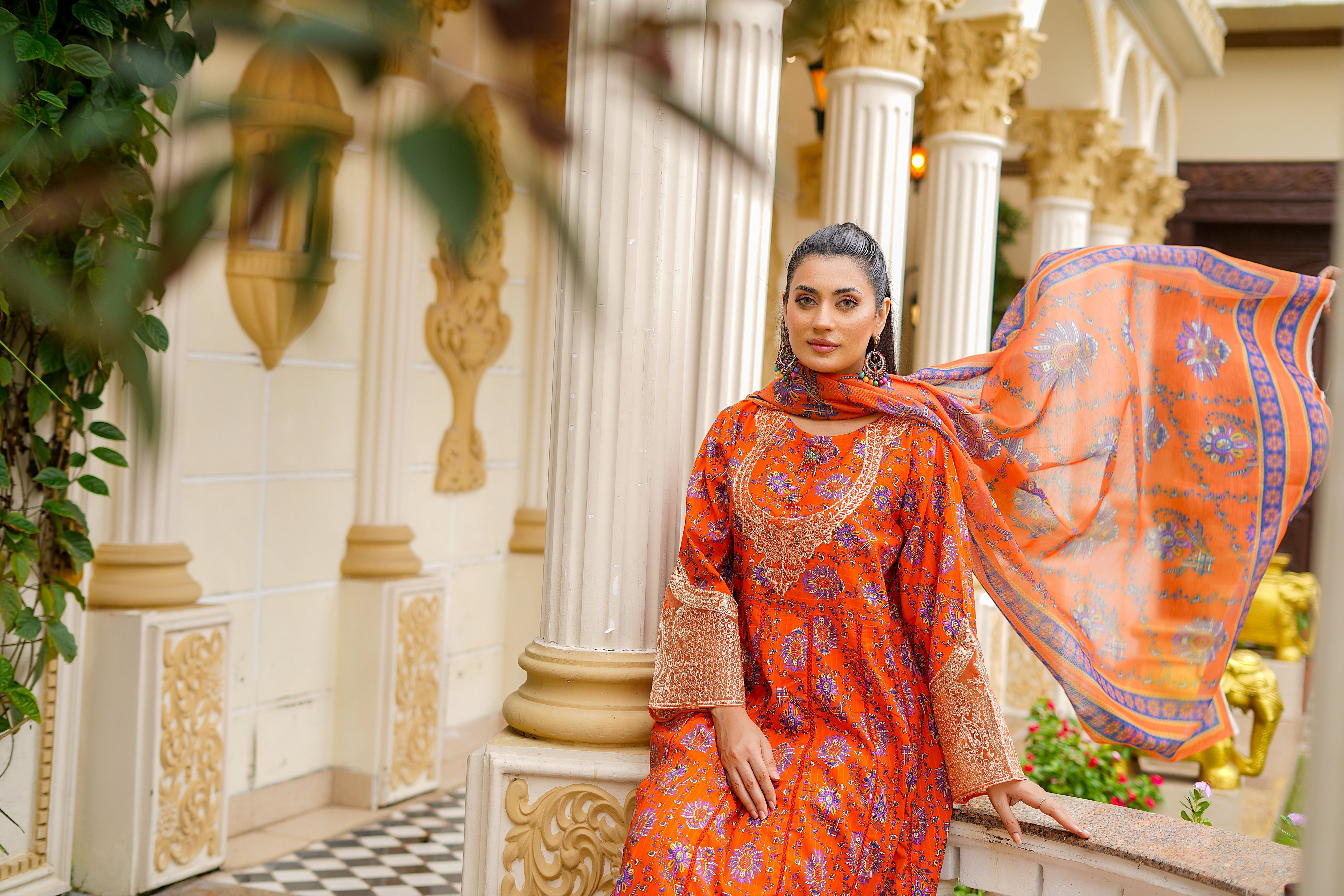 This exquisite festive/party wear Pishwas set exudes elegance in deep. The straight cut kurta features intricate embroidery, while the cotton shalwar adds a traditional touch. Complete with a matching dupatta in lawn fabric, this 3-piece ensemble is perfect for all seasons. Lining attached for convenience. Brand: Gulposh By Kkt.