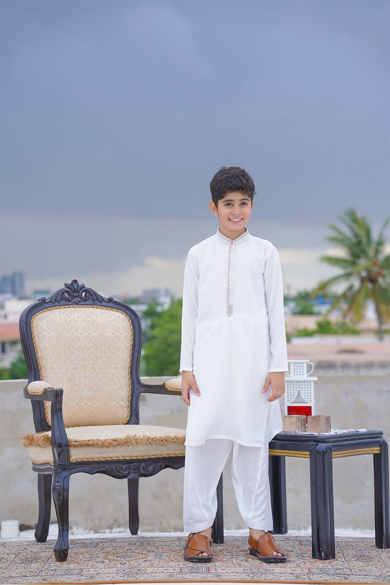 Formal Style Kameez Shalwar Suit for Kids , Easy Iron ,Soft Medium Fall Finish Fabric , Formal Fabric with Hand embriodrey on the collar and the front placket