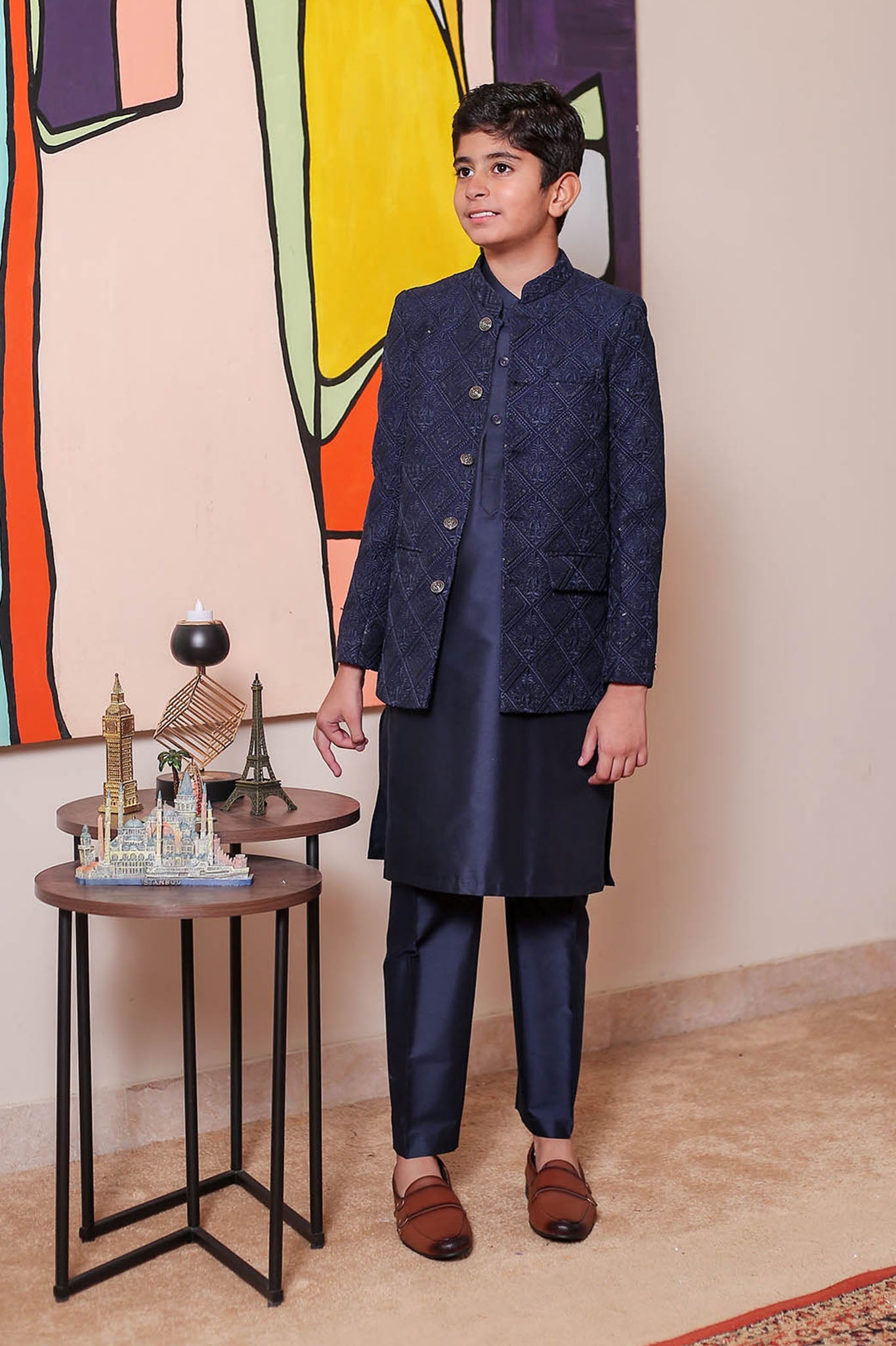 Formal Style Prince Coat for Kids , Jamawar Fabric in Navy Blue Colour with Rich Embriodrey Weaved Design , Special for Festive And Wedding Wear