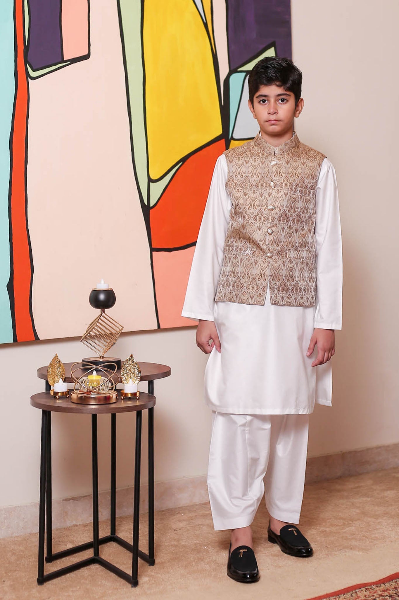 Formal Style Waist Coat for Kids , Jamawar Fabric in Coffee Colour with Rich Weaved Design , Special for Festive And Wedding Wear