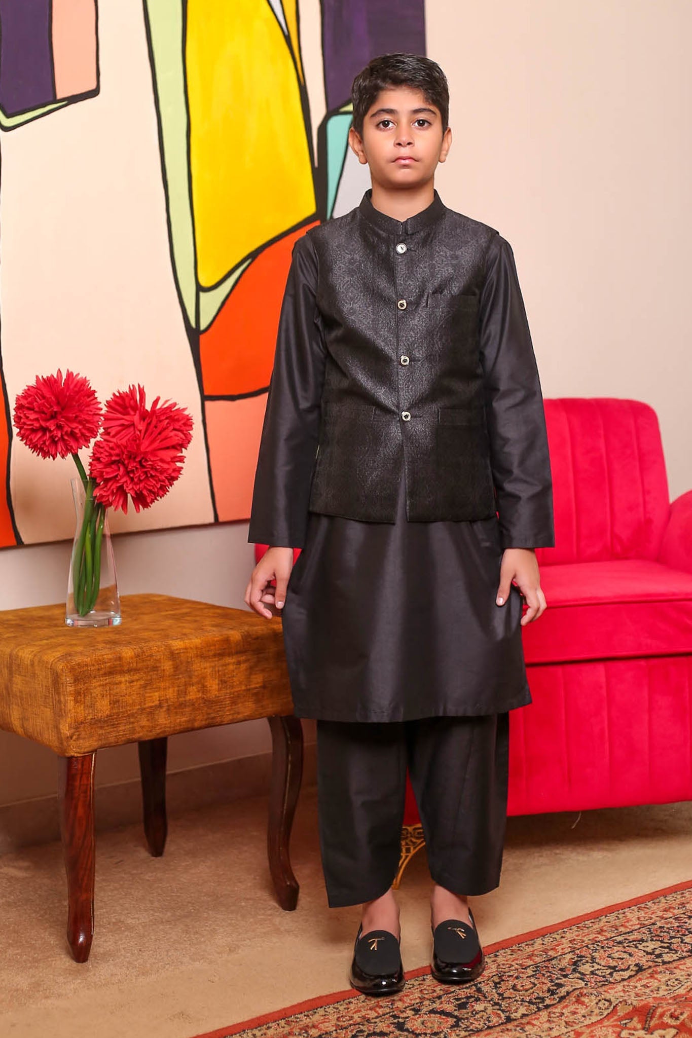 Formal Style Waist Coat for Kids , Jamawar Fabric in Black Colour with Rich Weaved Design , Special for Festive And Wedding Wear