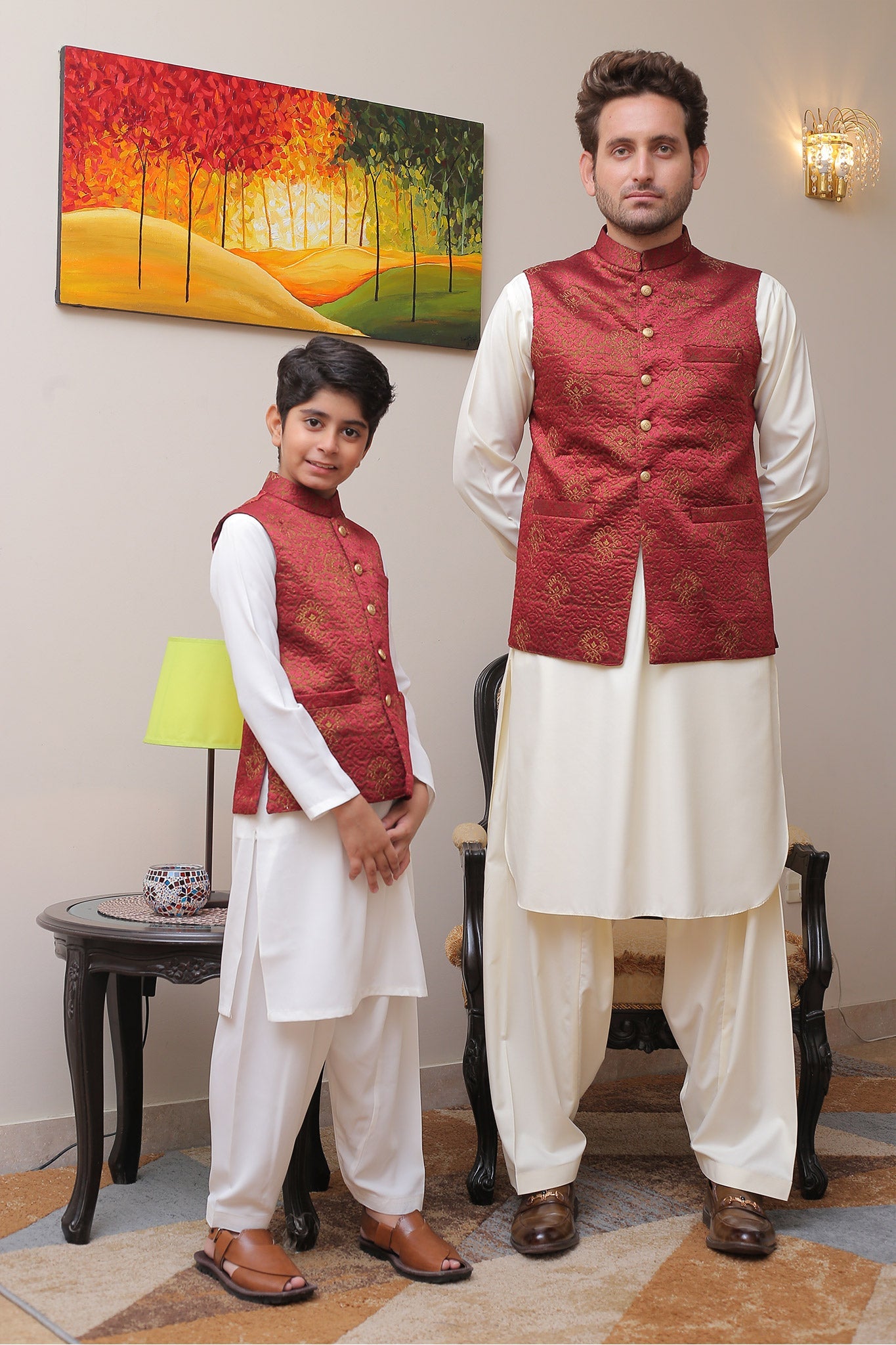 Formal Style Waist Coat for Kids , Masoori Fabric with Rich Weaved Design Along With Maroon Thread Work Contrast Brown Zari , Special for Festive And Wedding Wear
