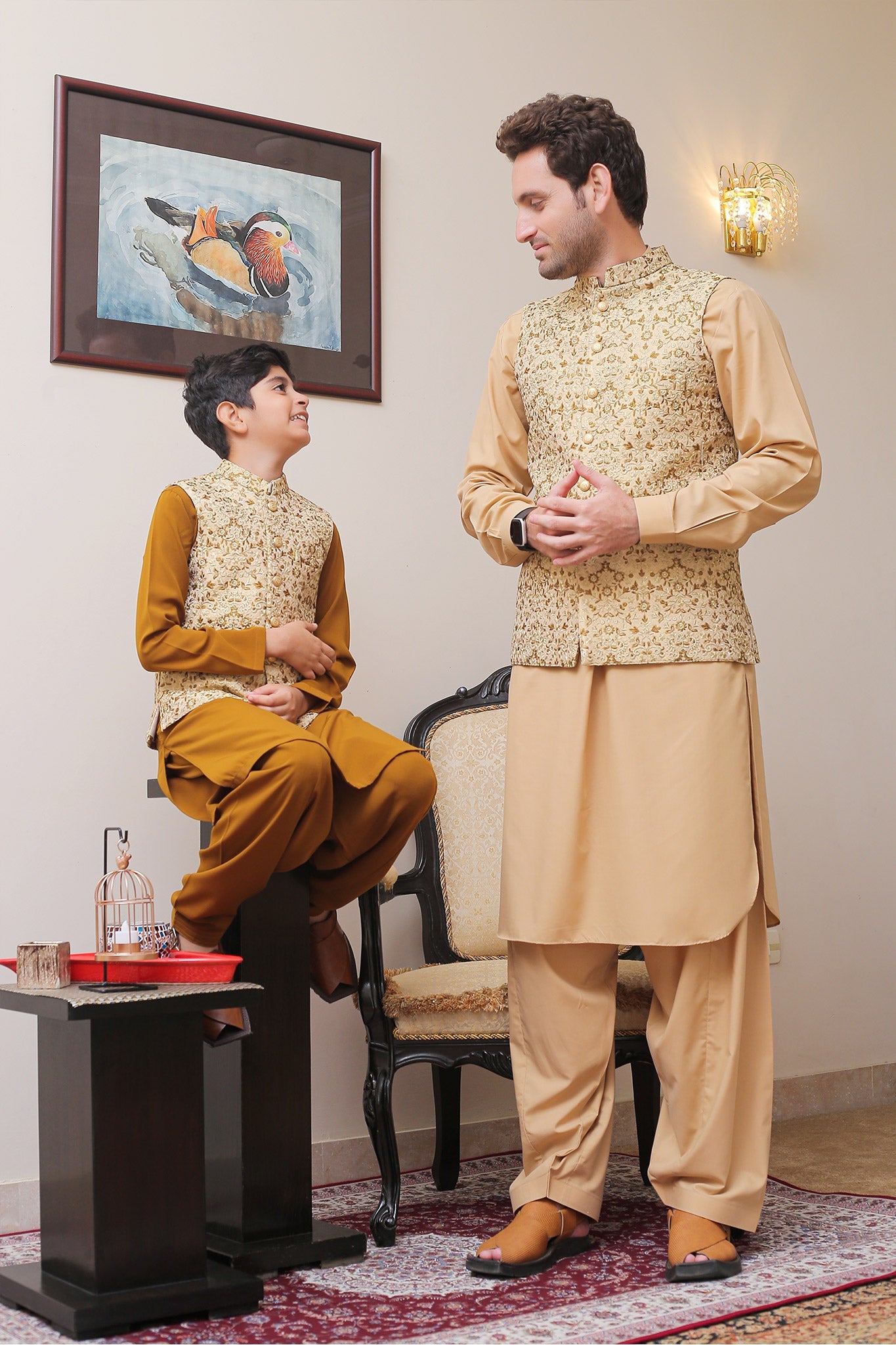 Formal Style Waist Coat for Kids , Katan Jamawar Fabric with Rich Geomatric Weaved Design Along With Gold And Brown Zari Work Making it Look Shiny Yet Elegent , Special for Festive And Wedding Wear