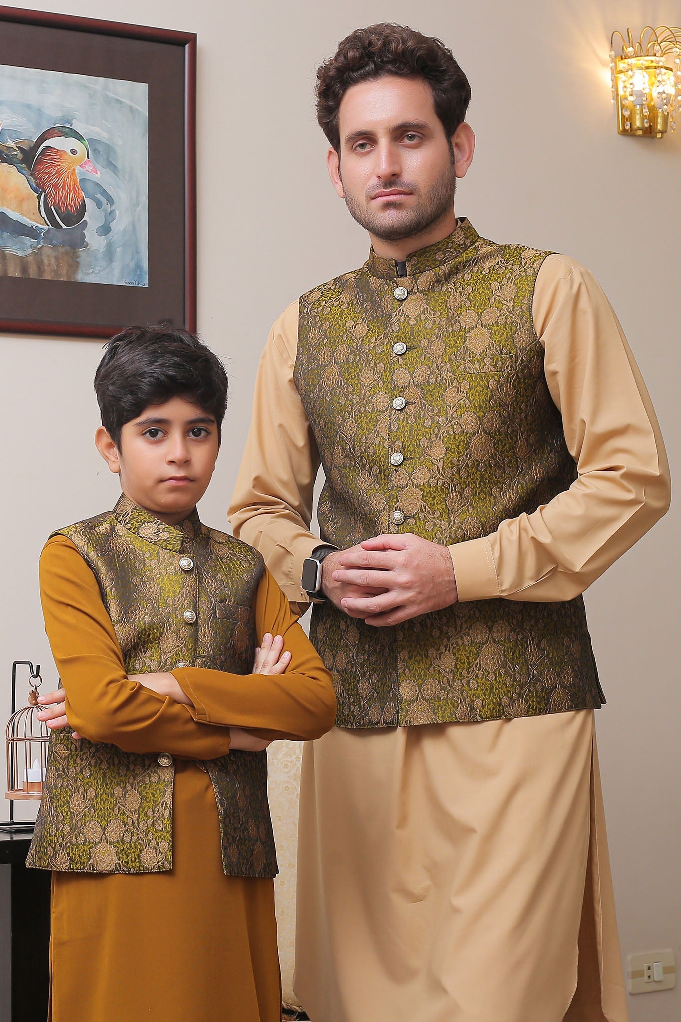 Formal Style Waist Coat for Kids , Jamawar Silk Fabric , Matt Finish Fabric , With Rich Weaved Designed Thread Work and Brown Zari Contrast , Special for Festive And Wedding Wear