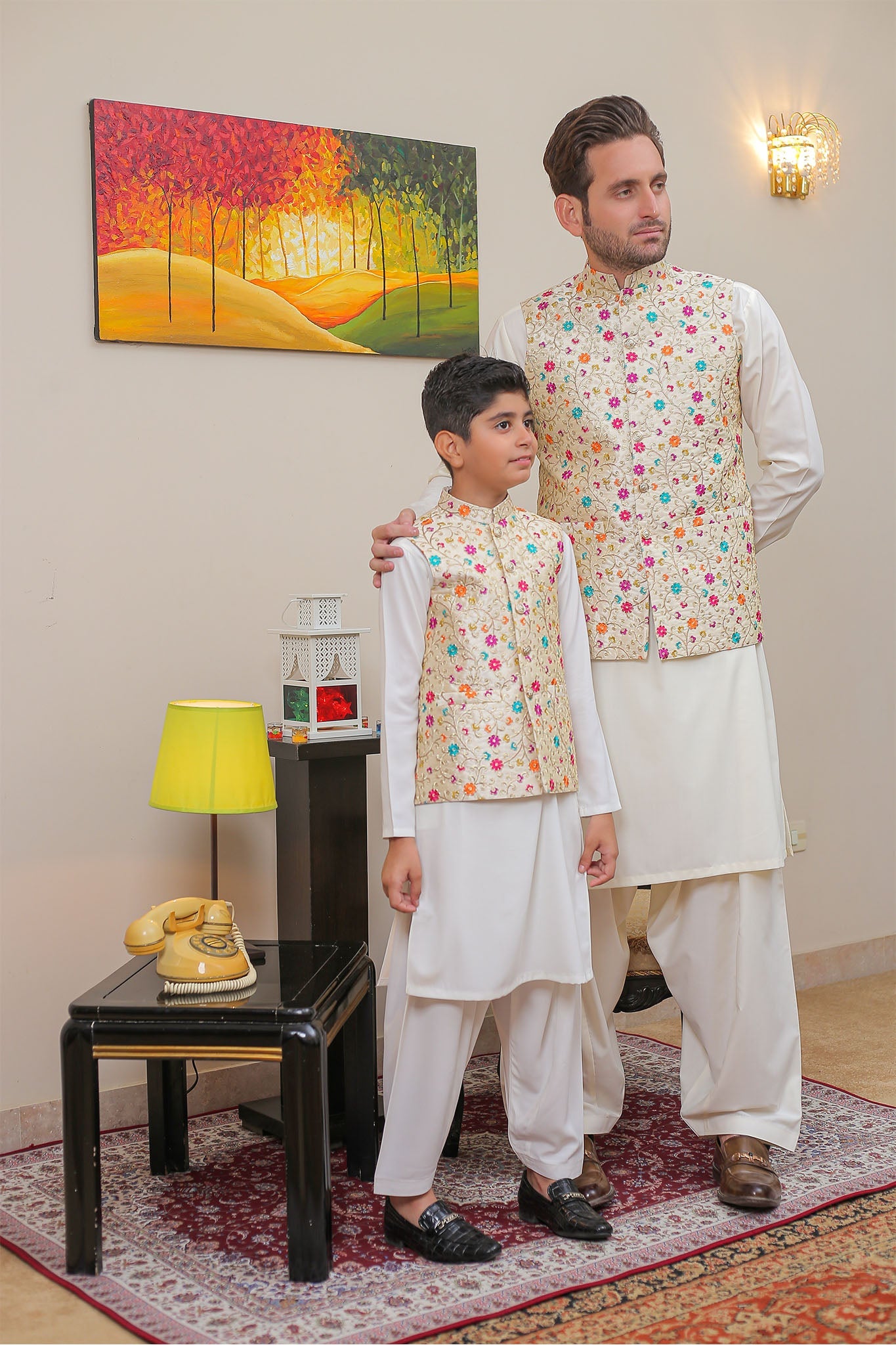 Formal Style Waist Coat for Kids , Raw Silk Fabric , With Rich Embriodrey Design in Thread and Zari Work With Multi Colours In contrast , Special for Festive And Wedding Wear