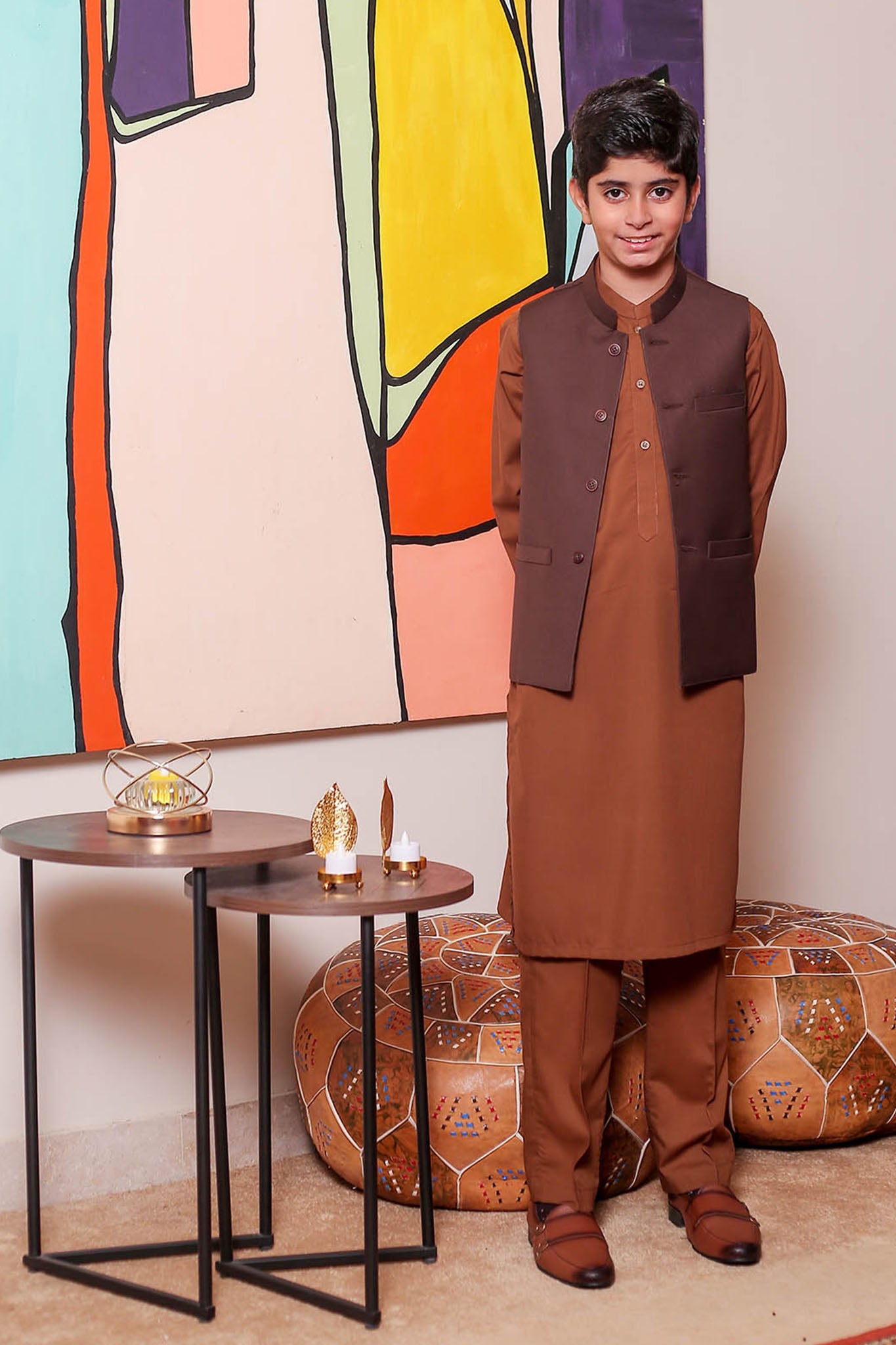 Formal Style Waist Coat for Kids , Suiting Fabric in Brown Colour with Rich Weaved Design , Special for Festive And Wedding Wear