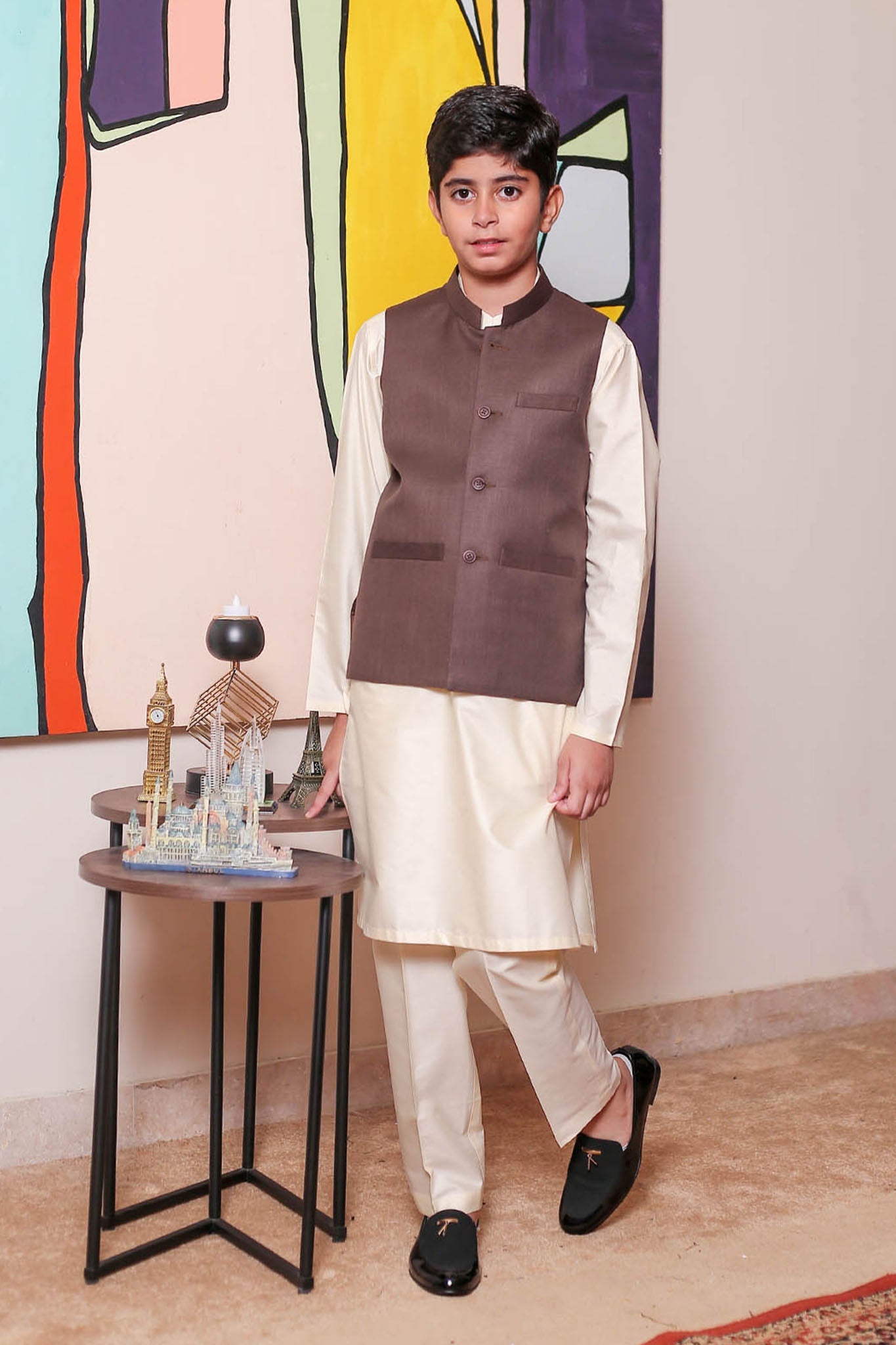 Formal Style Waist Coat for Kids , Suiting Fabric in Brown Colour with Rich Weaved Design , Special for Festive And Wedding Wear