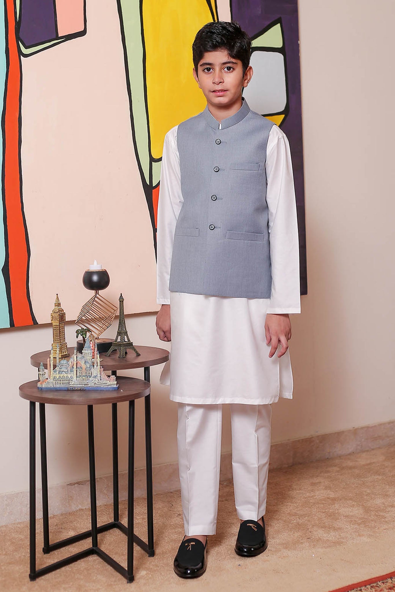 Formal Style Waist Coat for Kids , Suiting Fabric in Ash Grey Colour with Rich Weaved Design , Special for Festive And Wedding Wear