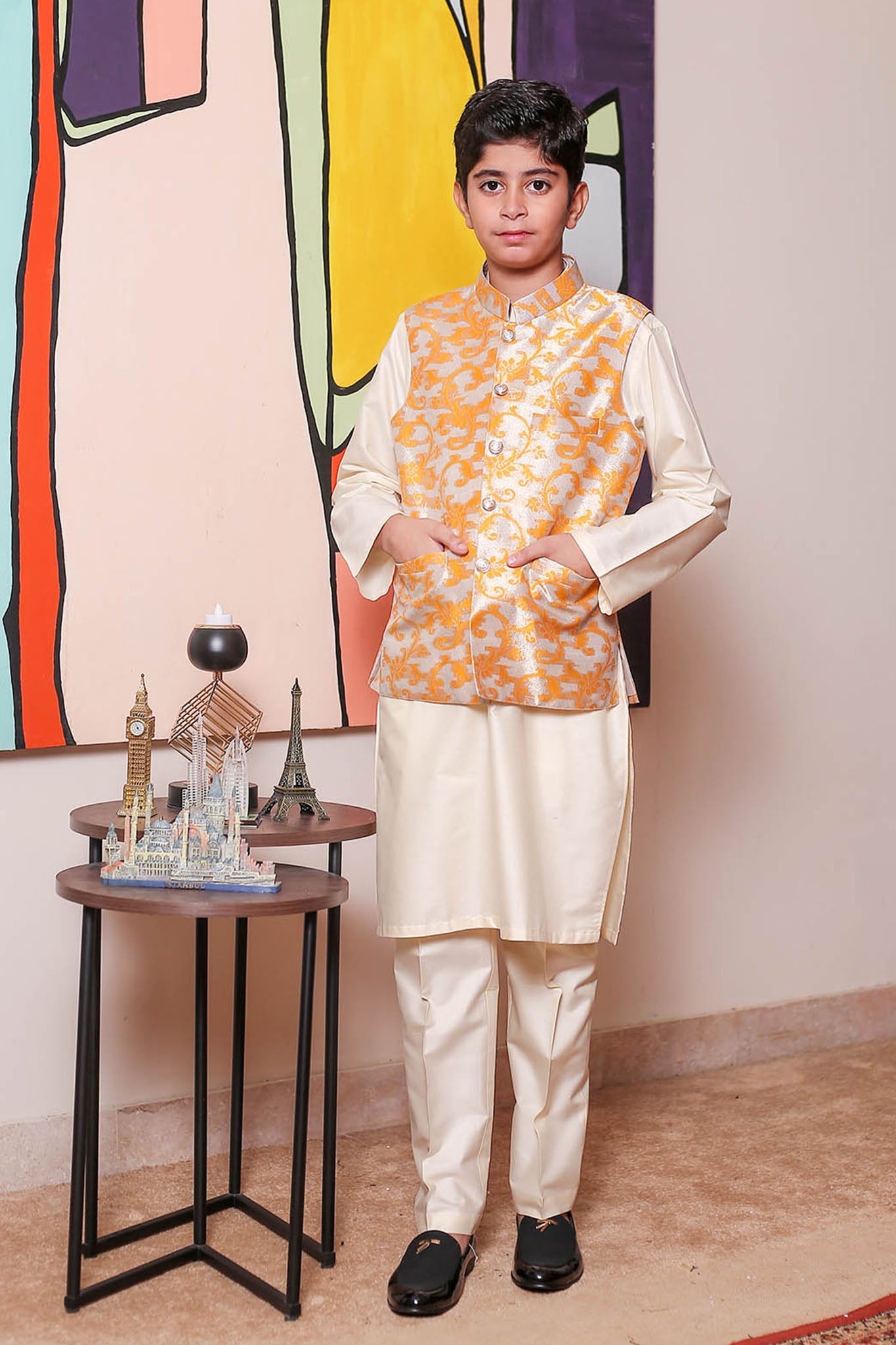 Formal Style Waist Coat for Kids , Jamawar Fabric in Yellow Colour and Rich Zari in Weaved Design , Special for Festive And Wedding Wear