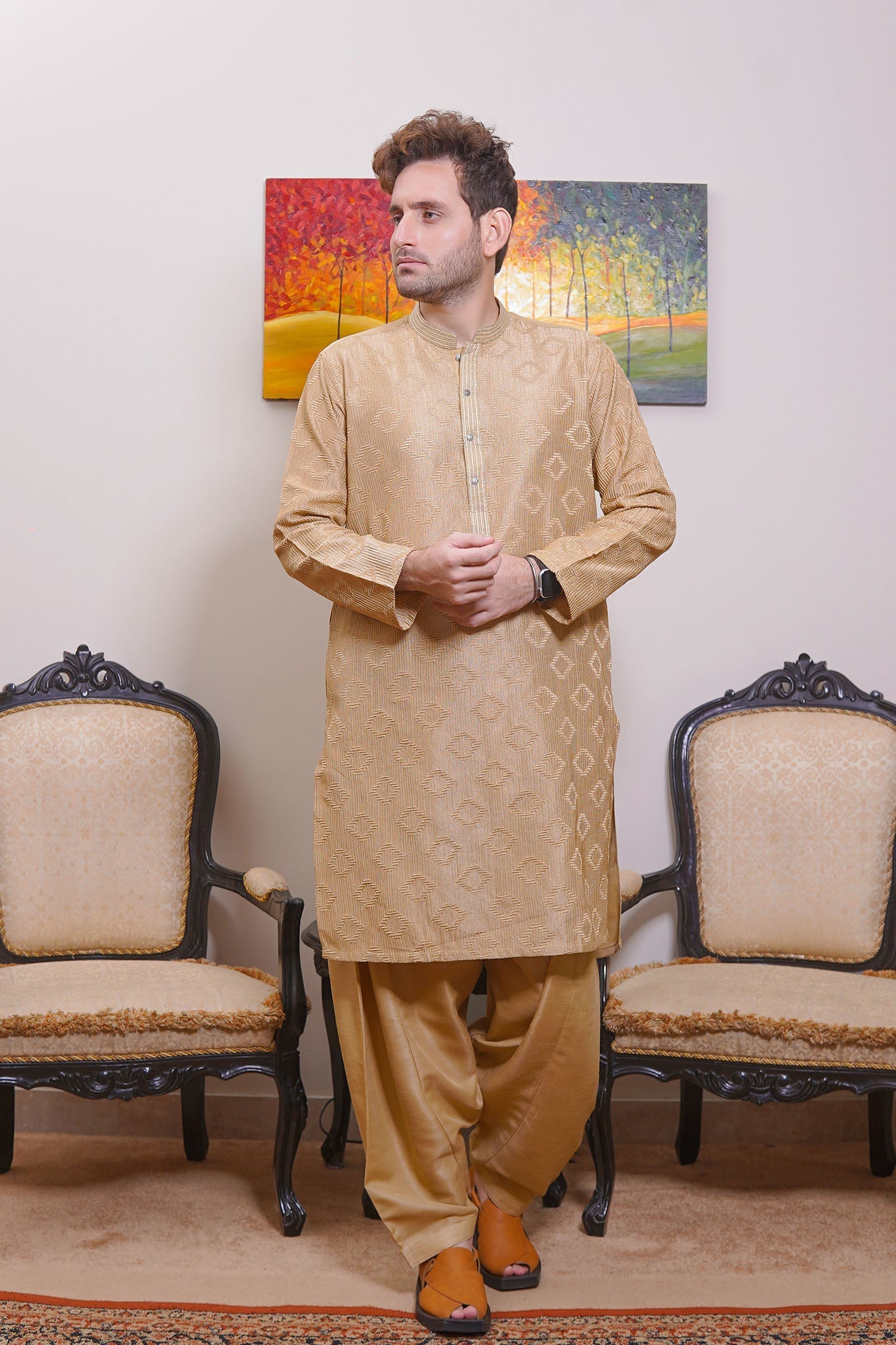 Formal Style Kameez Shalwar Suit for Men , Easy Iron , Formal Silk Base Fabric with Embriodred Front and Sleaves along with Hand Embriodrey on Collar and Front Placket , Special For Festive Use