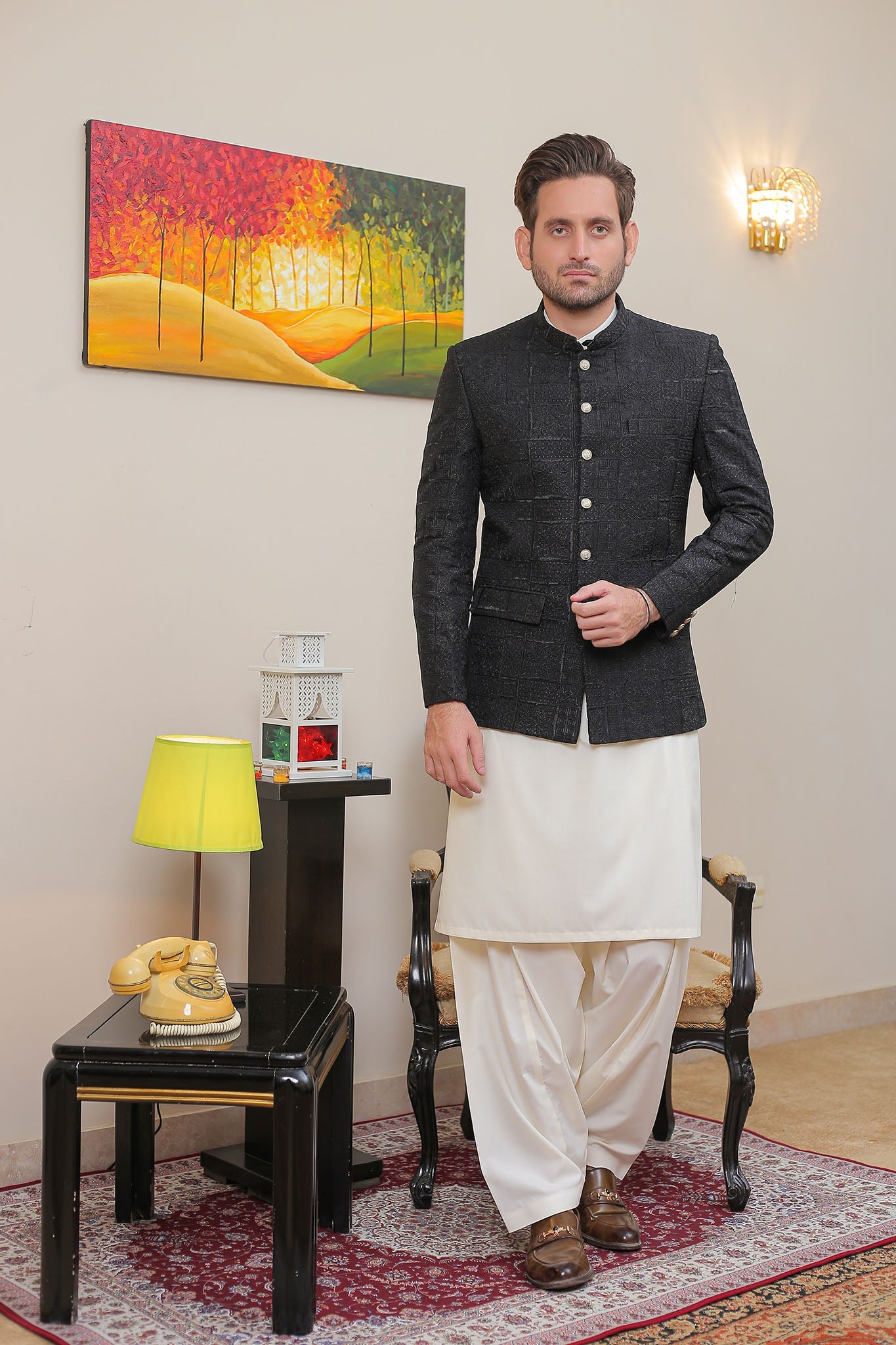 Formal Style Prince Coat for Men , Raw Silk Fabric , With Rich Embriodrey Design With Zari in Black on Black , Special for Festive And Wedding Wear