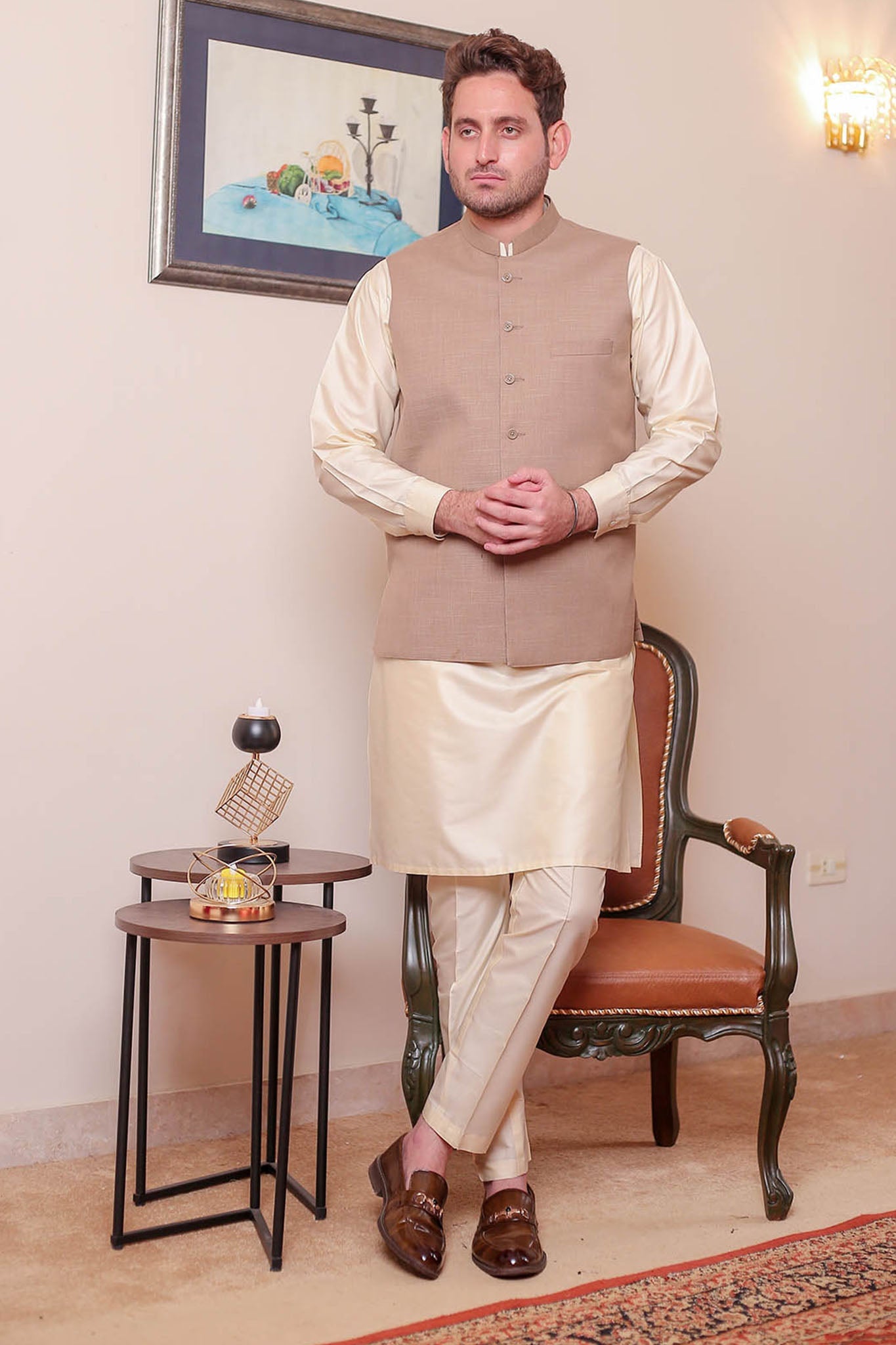 Formal Style Waist Coat for Men , Elegently Weaved Suiting Fabric in Beige Colour , Special For Office , Daily and wedding wear