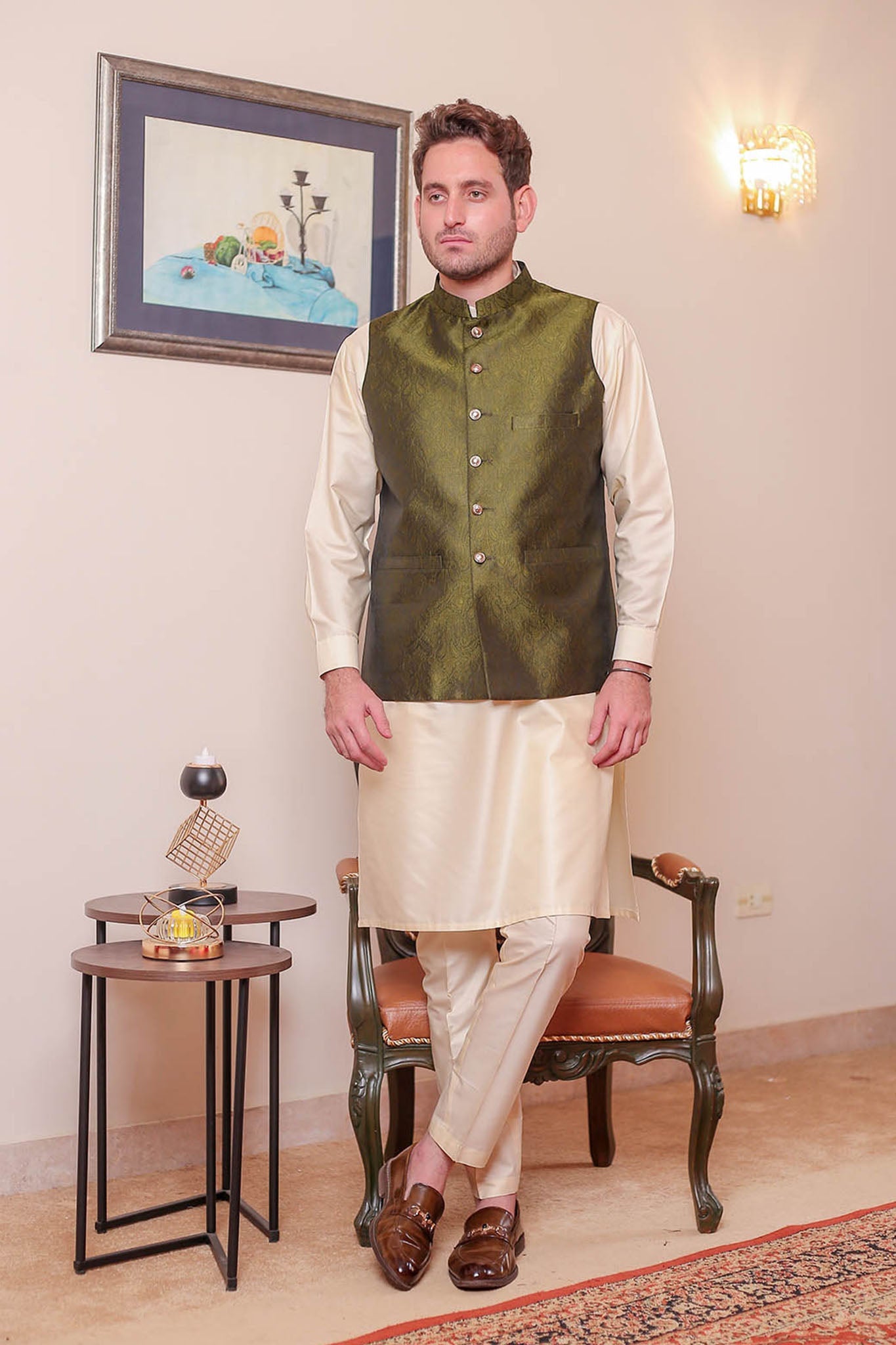 Formal Style Waist Coat for Men , Elegently Designed Jamawar Fabric in Green Colour ,Special For festive and wedding wear
