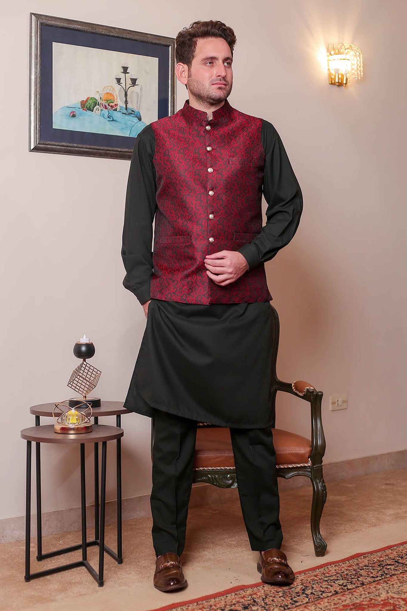 Formal Style Waist Coat for Men , Elegently Designed Jamawar Fabric in Maroon And Green Colour Weaving ,Special For festive and wedding wear