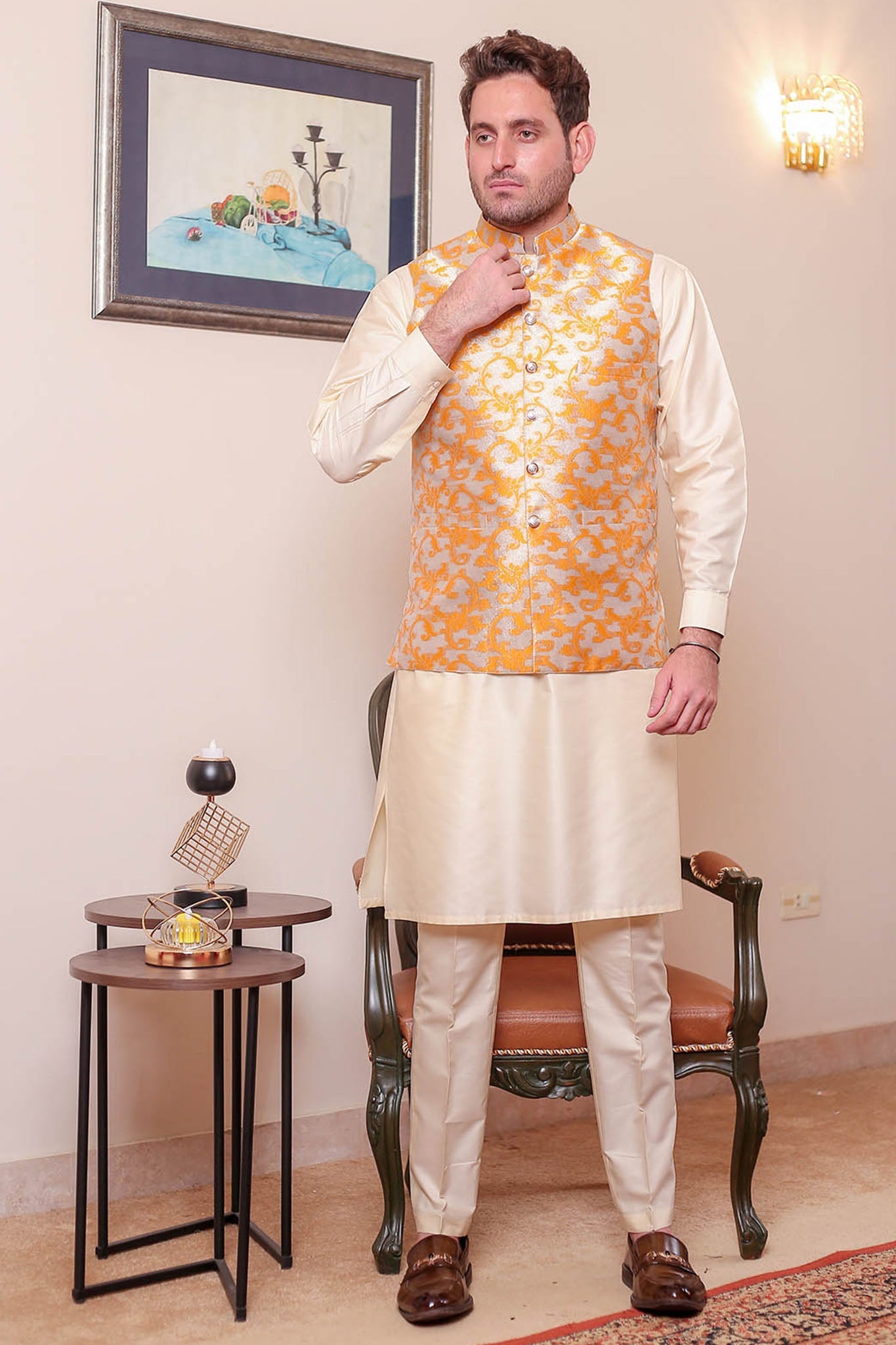 Formal Style Waist Coat for Men , Elegently Designed Jamawar Fabric in Yellow Colour with Zari Weaving ,Special For festive and wedding wear