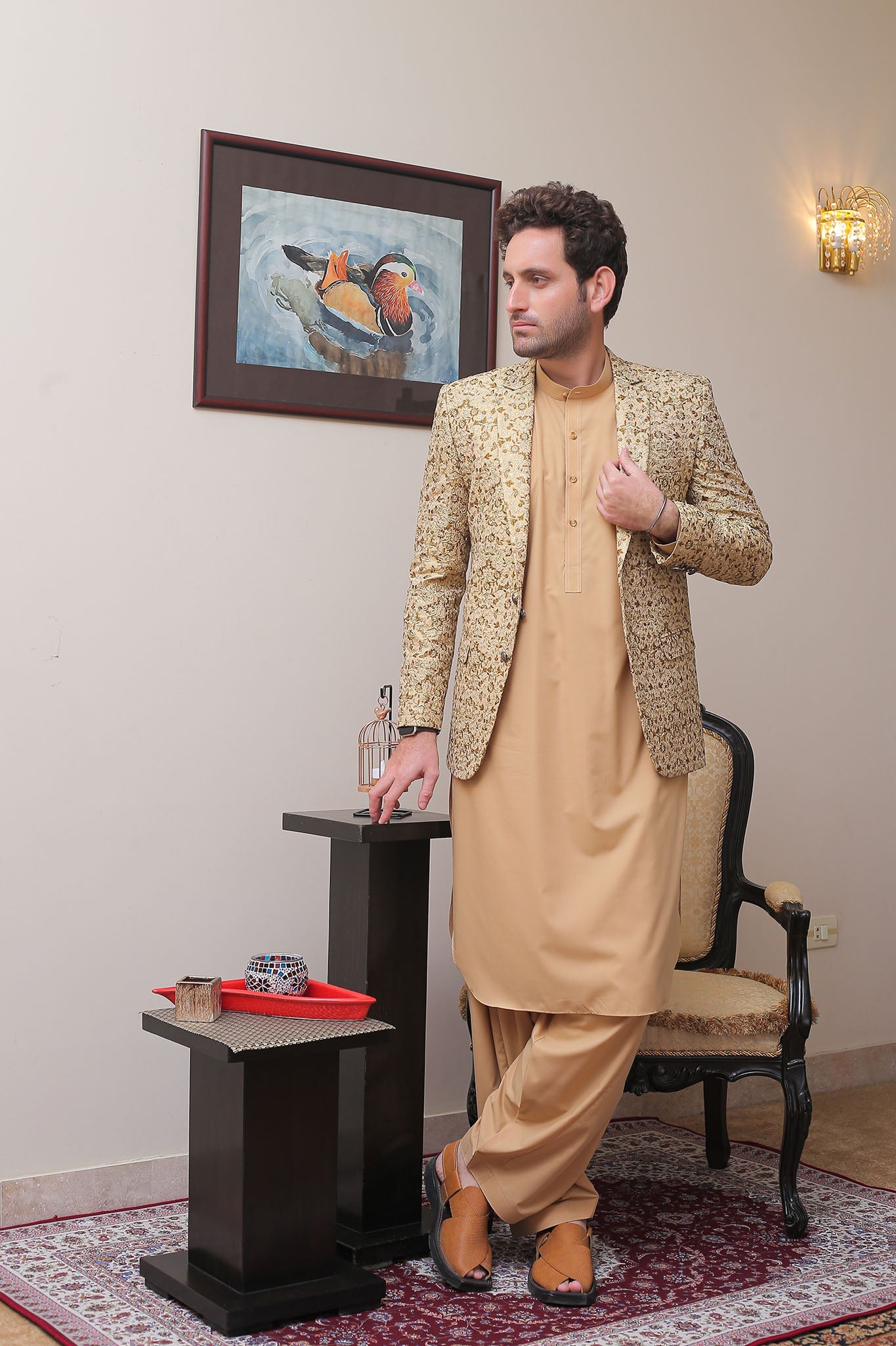 Formal Style Wedding Coat for Men , Katan Jamawar Fabric with Rich Geomatric Weaved Design Along With Gold And Brown Zari Work Making it Look Shiny Yet Elegent , Special for Festive And Wedding Wear