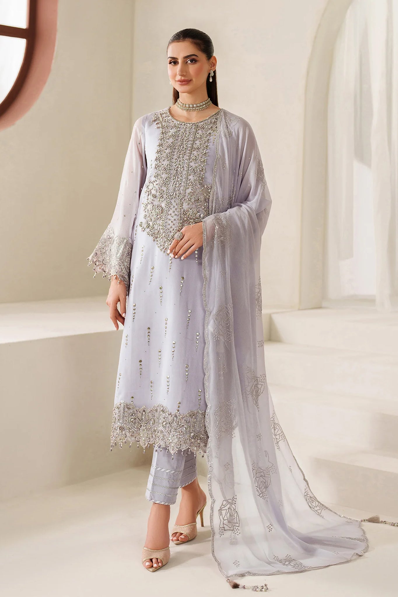 Mukaish Chiffon Front Mukaish Chiffon Sleeves Plain Chiffon Back Embroidered + Embellished Neck Patch (Organza) Embroidered + Embellished Front Border...