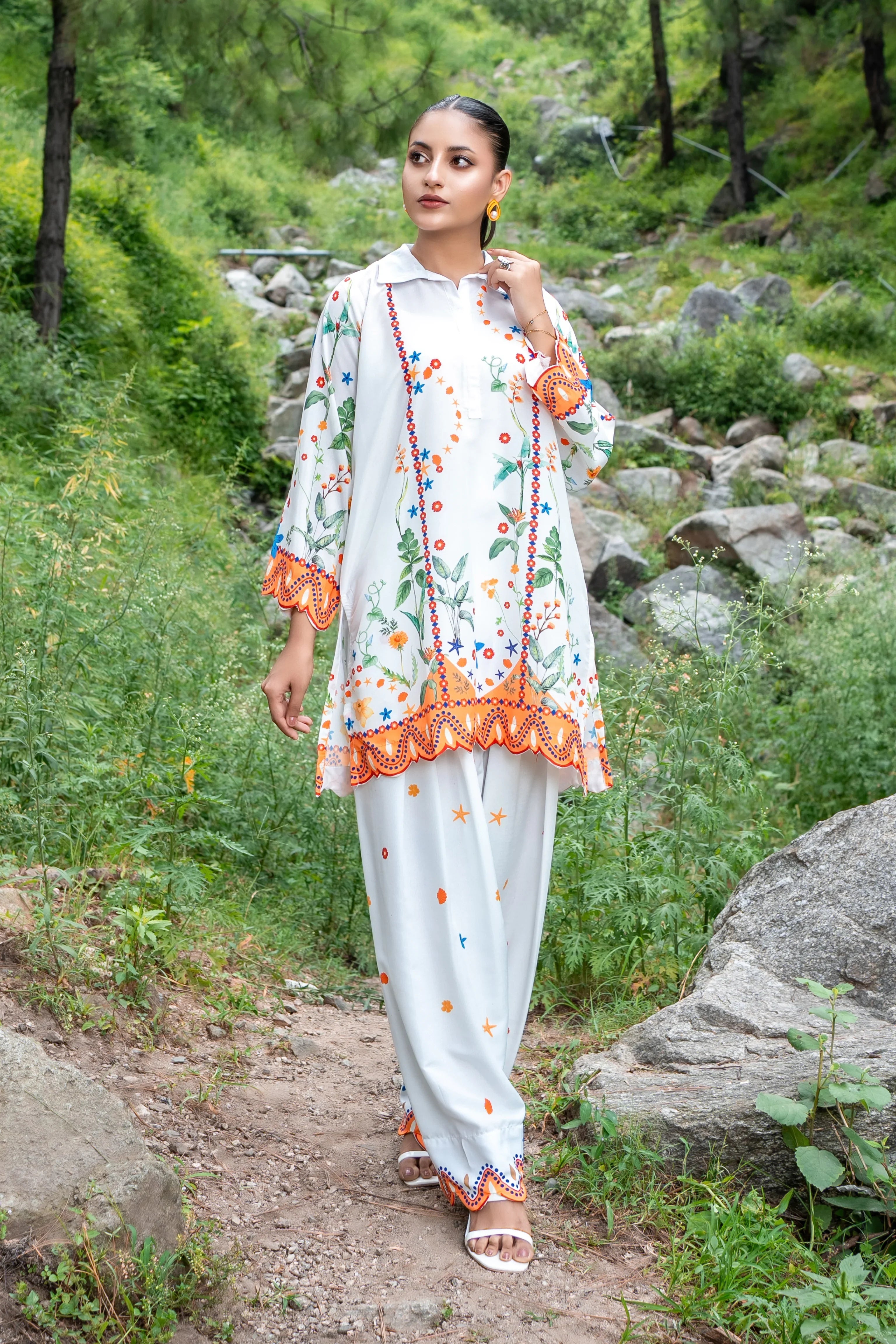 A beautifully printed two-piece featuring intricate floral patterns and a relaxed silhouette. The straight-cut shirt and matching farshi shalwar offer effortless elegance, perfect for both casual outings and semi-formal occasions.