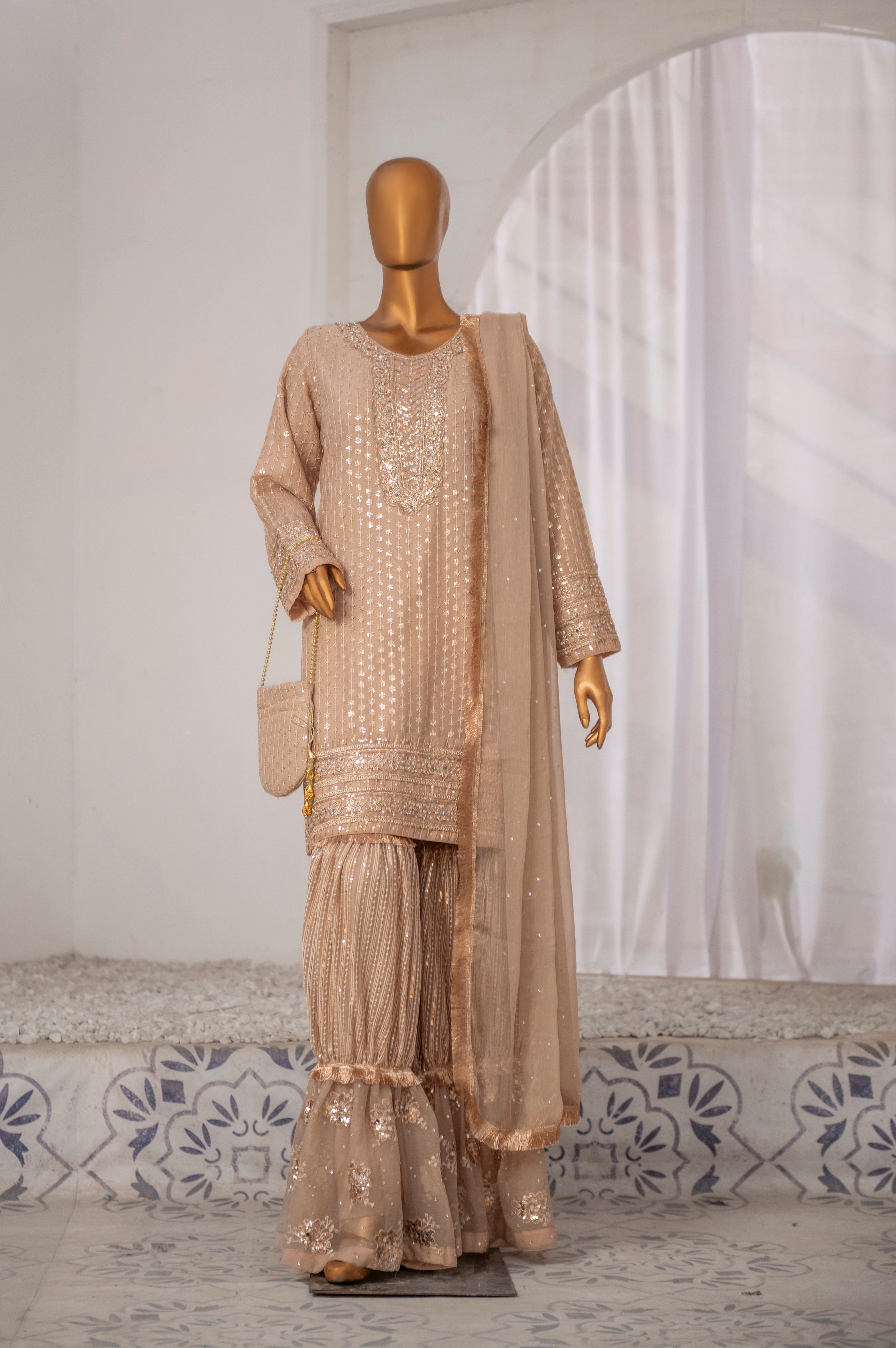 Stylish chiffon gharara embellished with detailed embroidery, paired with a lightweight chiffon dupatta accented with a scalloped lace border.