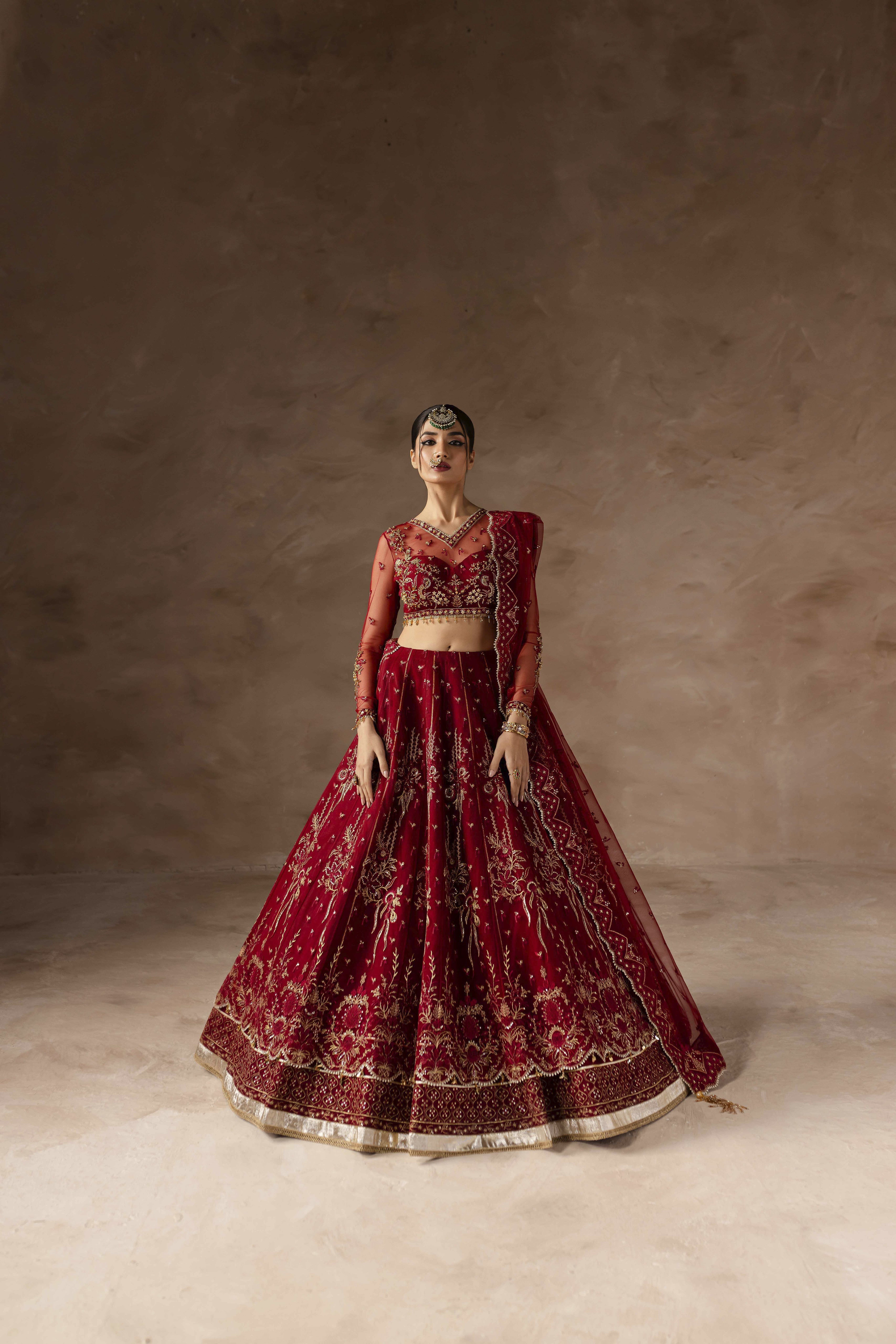 Drape yourself in eternal grace with this hand-embroidered red luxury lehenga. Designed for grand celebrations, it features intricate craftsmanship with Kulfi Drops, Bethki, Japanese Cutt Dana, Telenor Sitara, Berfi Ghota, Kashti Sitara, Cup Sitara, Kaanch Bantaa, Pearls, Crystals, Moti, and Pipe Work.