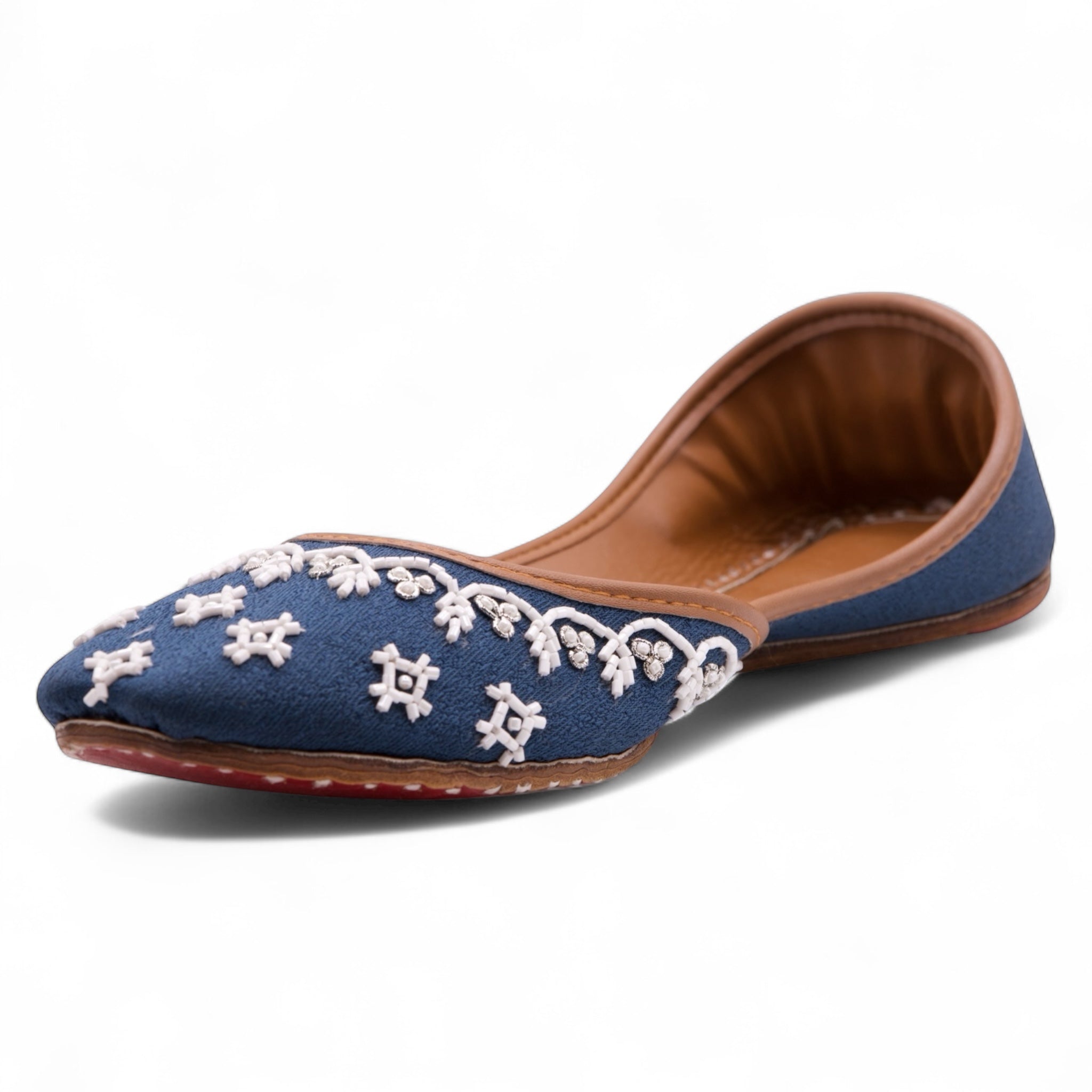 Our deep royal blue jutti, handcrafted to perfection. Featuring intricate white thread embroidery against a rich navy base, this jutti captures timeless tradition with a modern twist. The soft leather inner lining ensures maximum comfort.