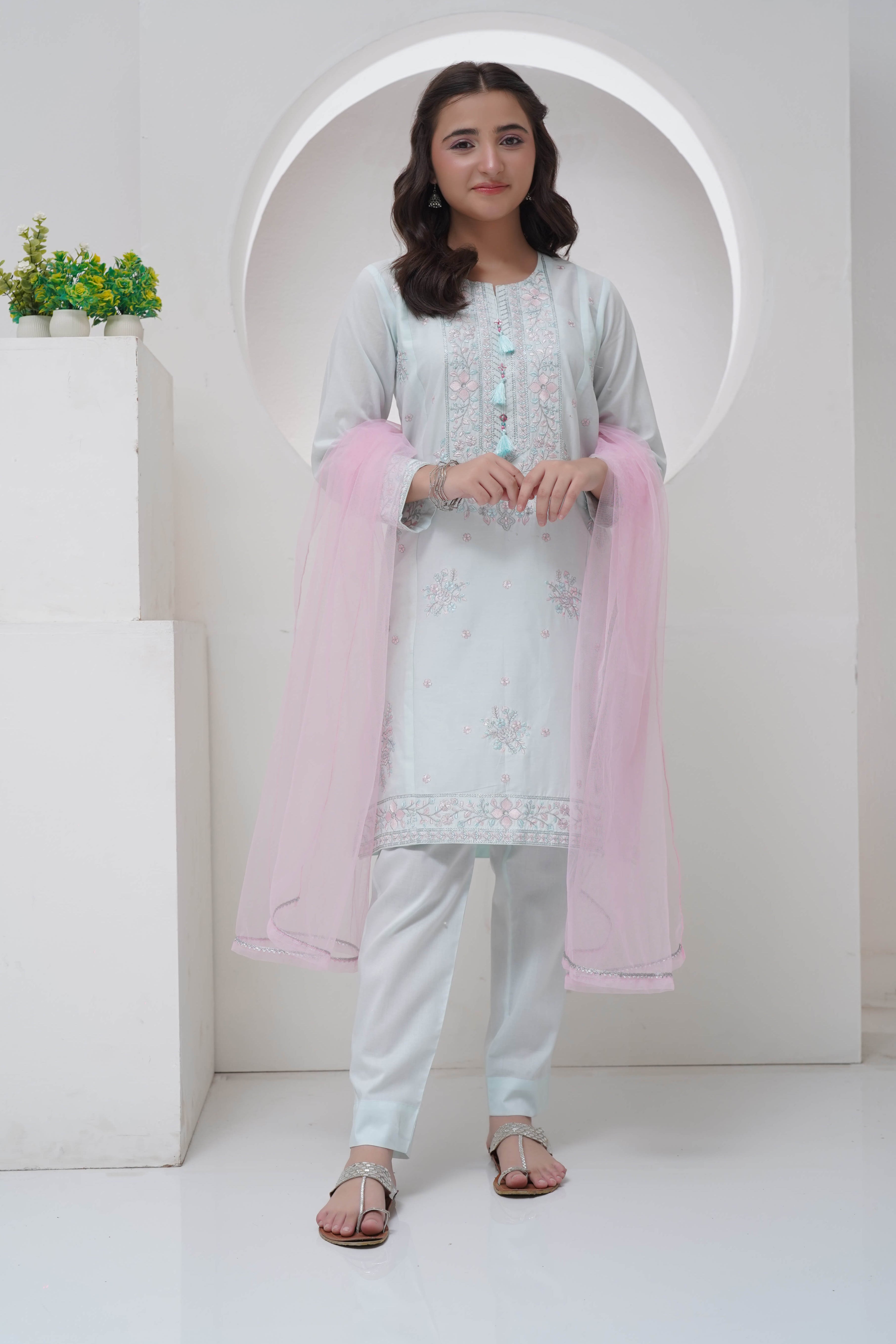 Step into elegance with this 3 Piece Embroidered Lawn Suit, designed to make a lasting impression. The light blue cambric lawn shirt is beautifully embroidered, paired with matching trousers for a graceful look. To complete the ensemble, a pastel pink organza dupatta adds a touch of sophistication and charm. Perfect for festive occasions, semi-formal gatherings, or evening wear, this outfit is a versatile choice that blends tradition with modern elegance.