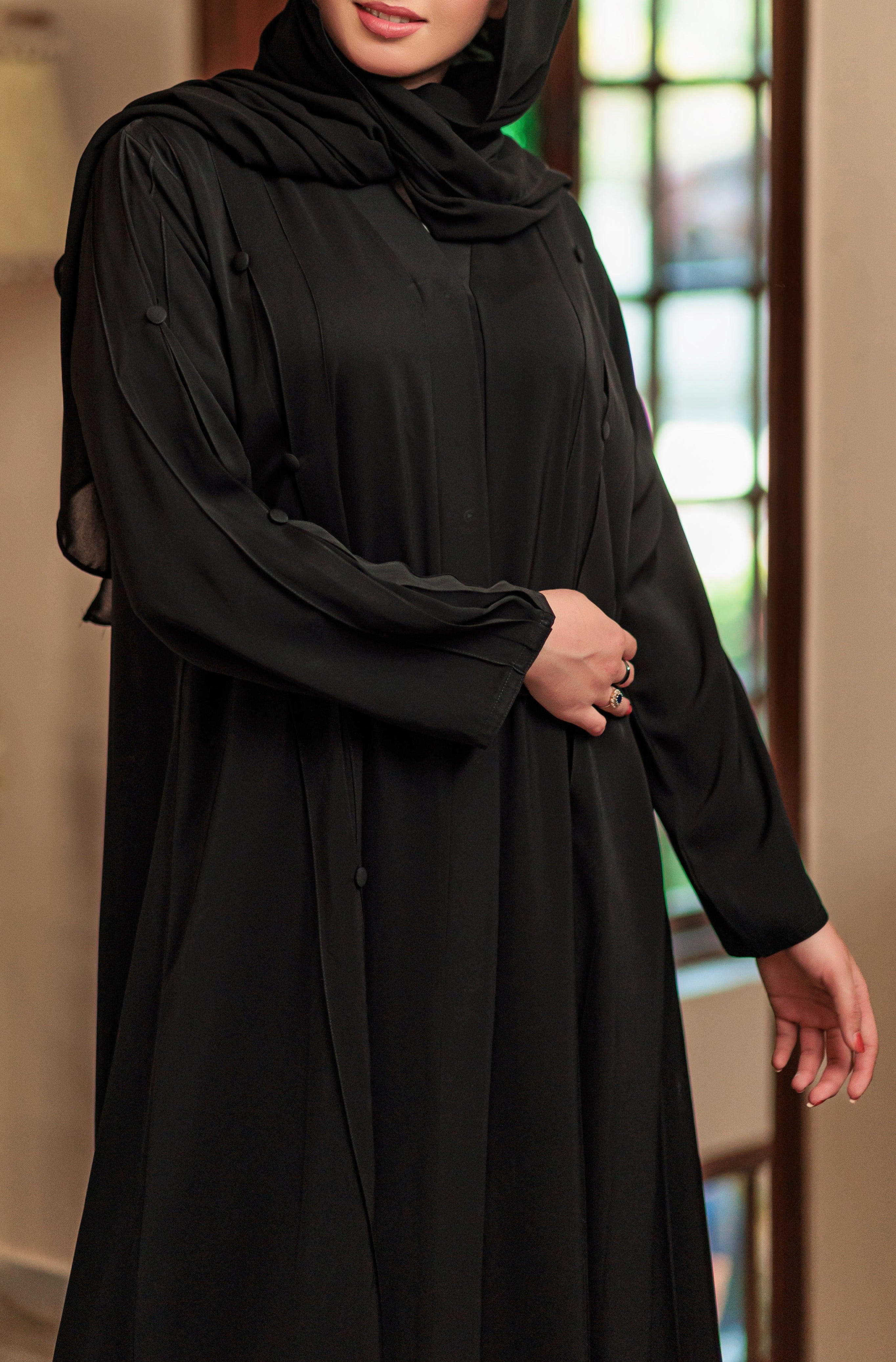 Our simple, unique and heavenly gorgeous designed abaya is for everyday wear simple designed sleeves with printex and style buttons all over the body and V-neck, comes along with chiffon Sheila
