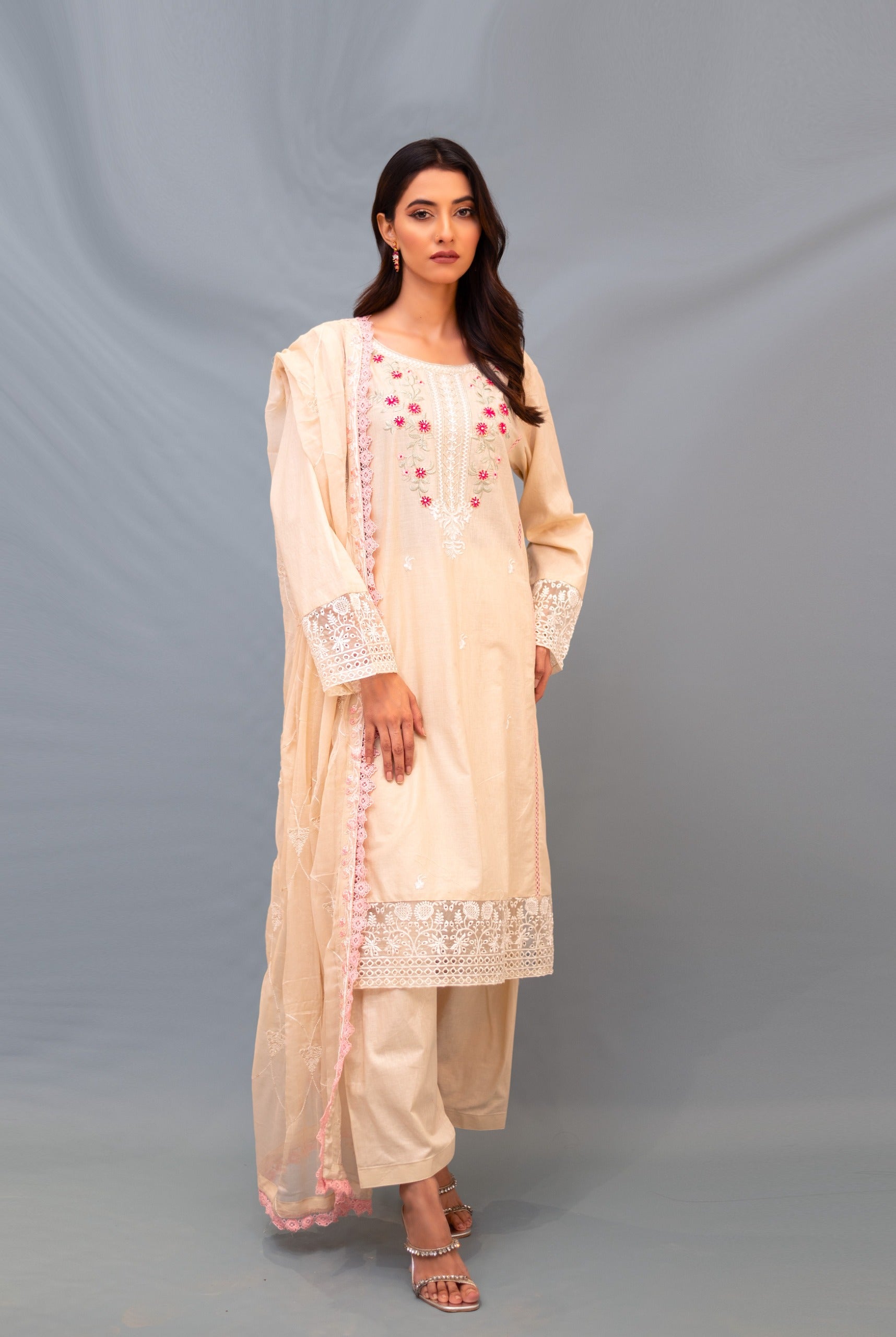 Contrasting resham & bead embroidery along with lace decoration on this warm toned ensemble make it the perfect fit for your day and night plans.