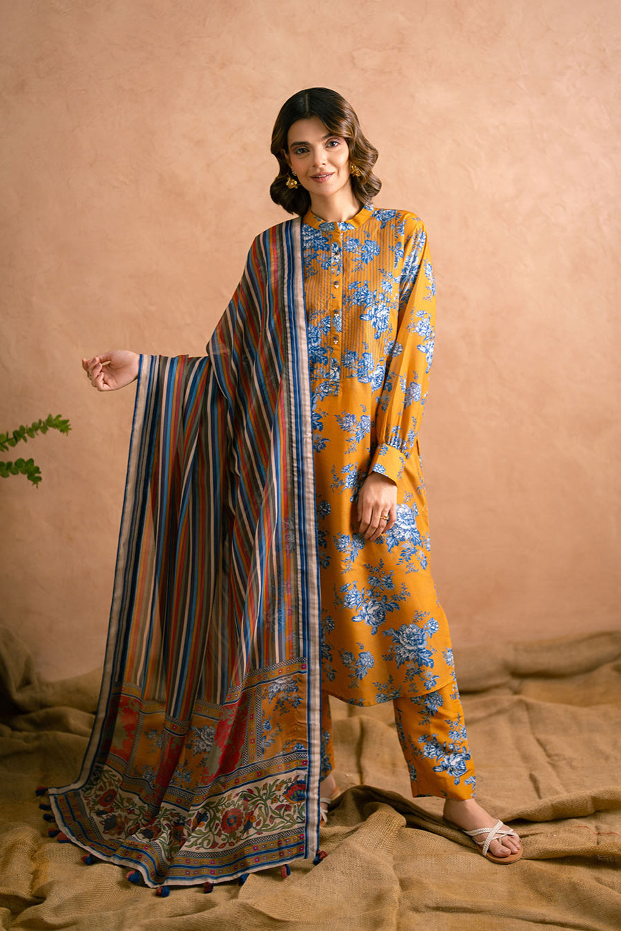 Refresh your style with our Eastern Kurta, featuring a vivid mustard background with elegant blue floral bunches.